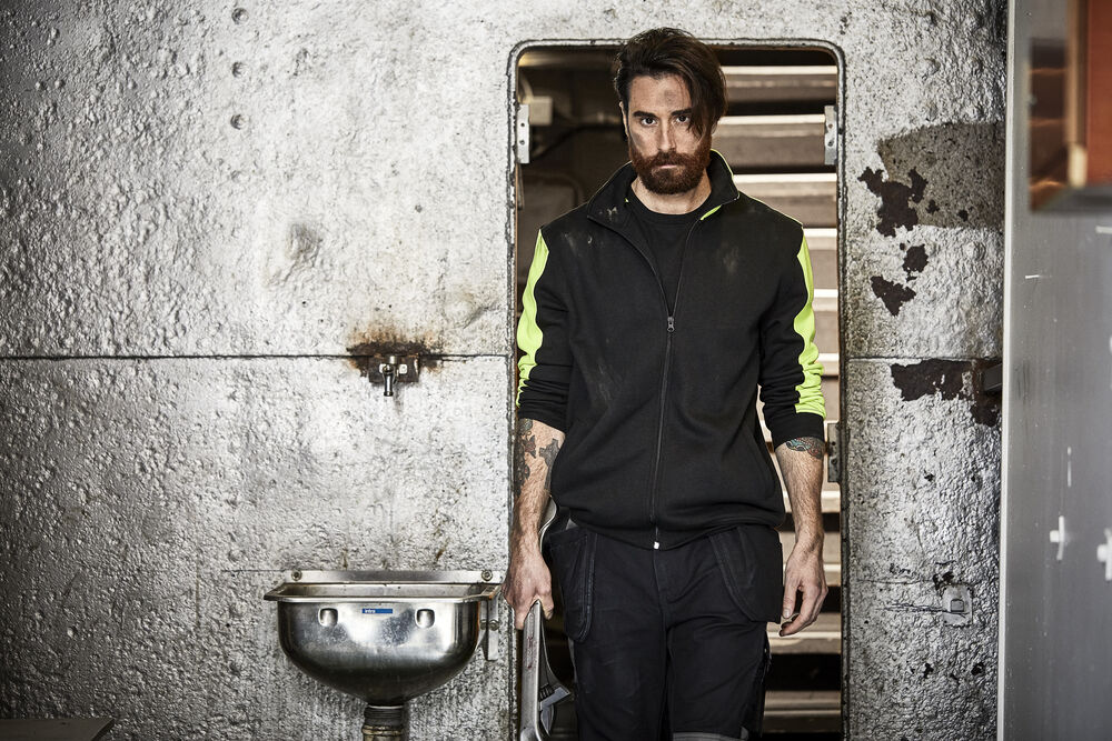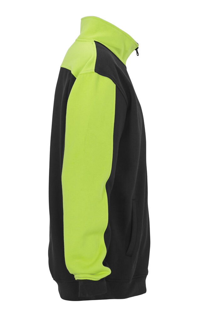 Genser med glidelås i front. Kontrastfarge på erm, krage og skulderparti.