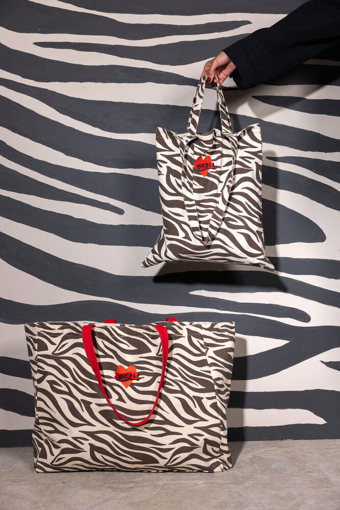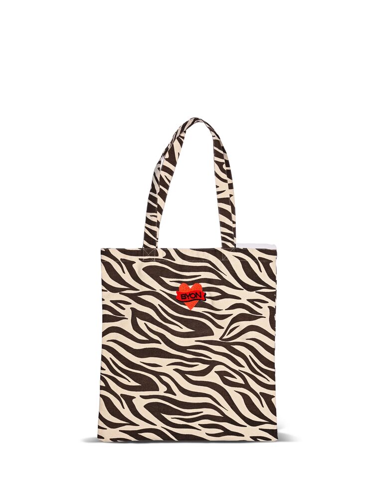 Shoppingvesken Anima er det perfekte handlenettet som kombinerer funksjonalitet og lekenhet. Den har et kult sebramønster i brunt og krem, og er dekorert med et rødt, vintageinspirert Byon-hjerte. Laget av økologisk bomull og utstyrt med doble håndtak i ulike lengder for ekstra praktisk bruk. En veske du alltid vil ha med deg – spesielt på shoppingrunden. Størrelse 40 × 44 cm. Designet av Byon Studio.