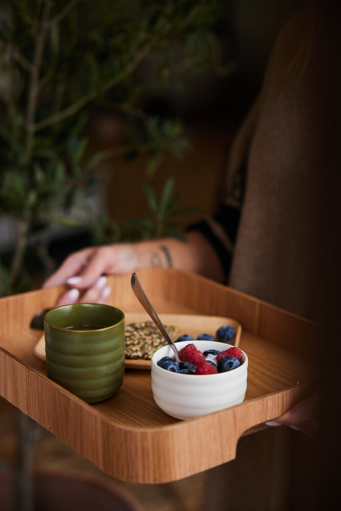 Hanna tallerken er laget av rødeik fra sertifisert ansvarlig skogbruk, – et elsket materiale som er slitesterkt og passer i alle hjem. Tallerkenen er rektangulær med buede kanter. En perfekt tallerken til kveldsmaten, kaffen på terrassen eller til bruk som et lite brett.