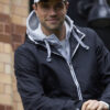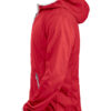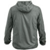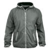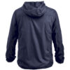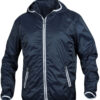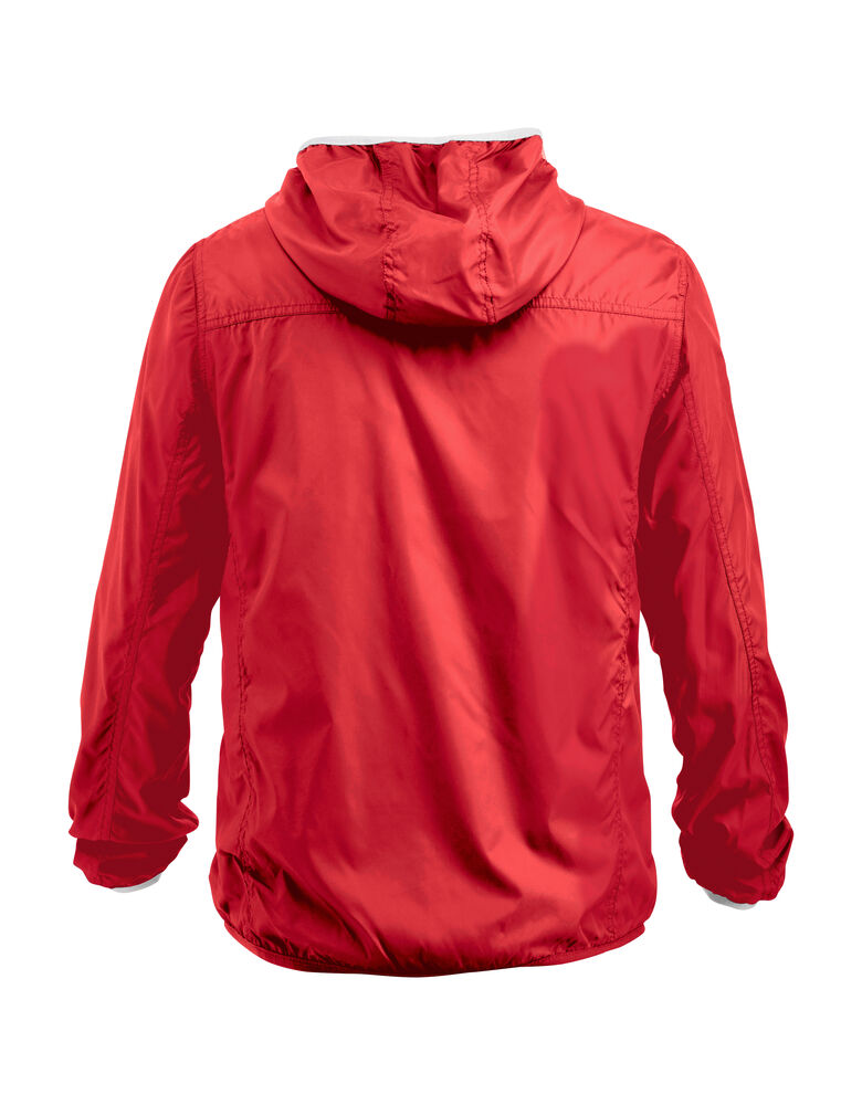 Moderne vindjakke med hette samt metall-lignende glidelåser. Meshfôr på innsiden. Kantbånd på hette og nederkant av ermene i kontrastfarge