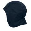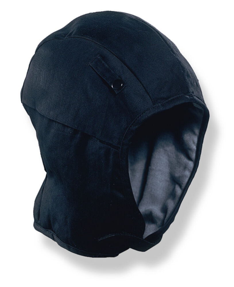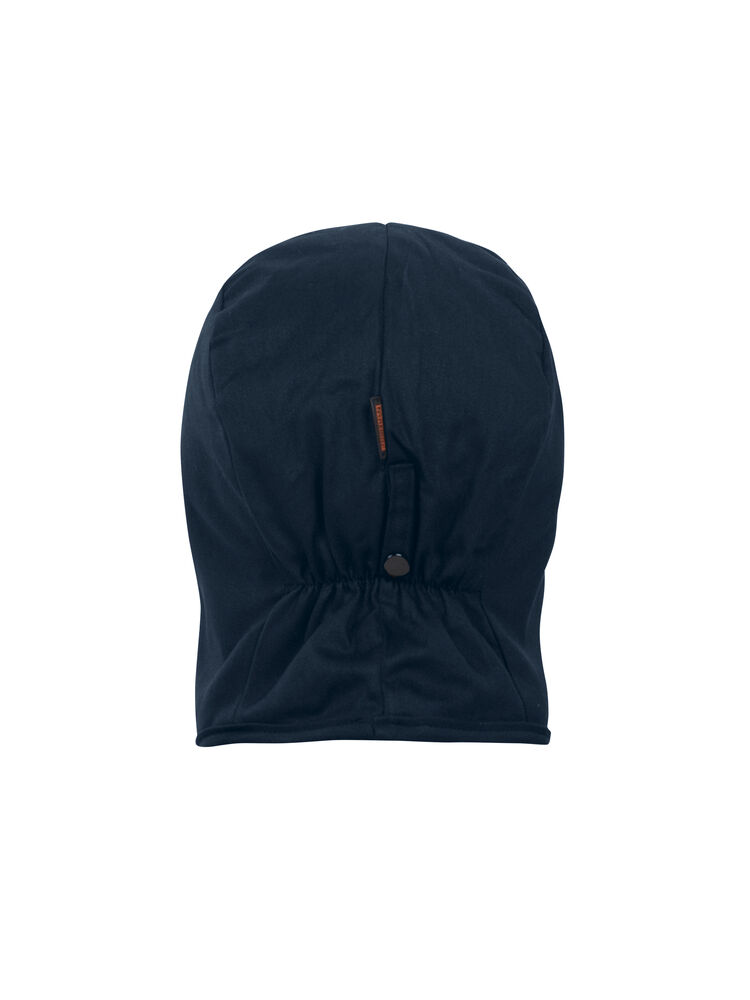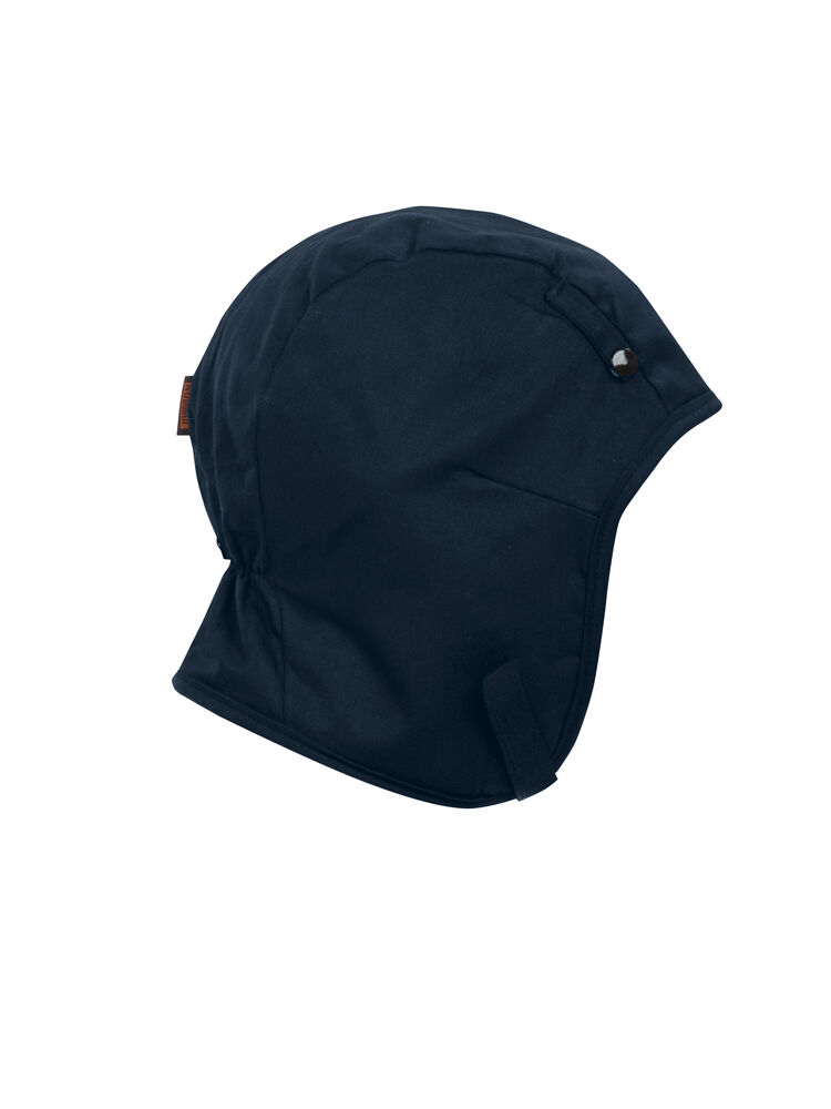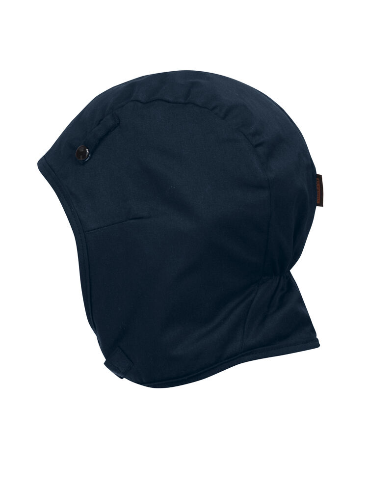 Hjelmlue med flanellfôr. Hakebånd med borrelås. 3 hjelmfester (2 foran, 1 bak) med trykknapp. Elastisk søm i nakken for passform.