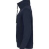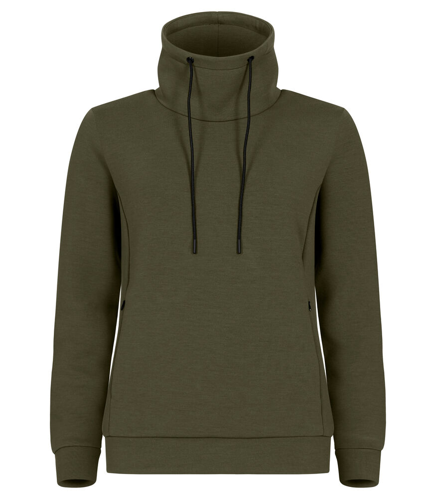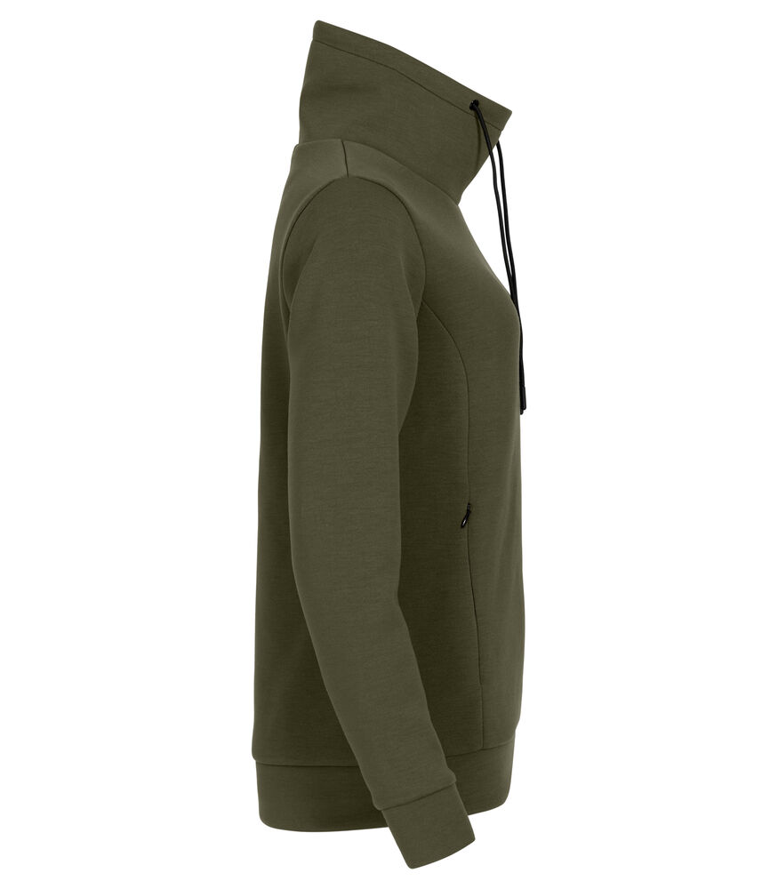 En høyhalset genser i et mykt Air Lyer-materiale. Genseren har to skjulte sidelommer med glidelås, og snøring i halsen. Mansjetter og nederkant i skallmateriale. Polyesteren som er brukt i genseren er resirkulert. Lett avtagbar etikett for rebranding.