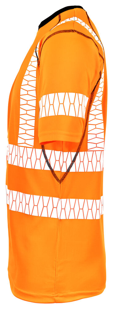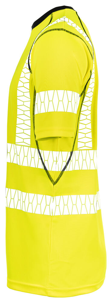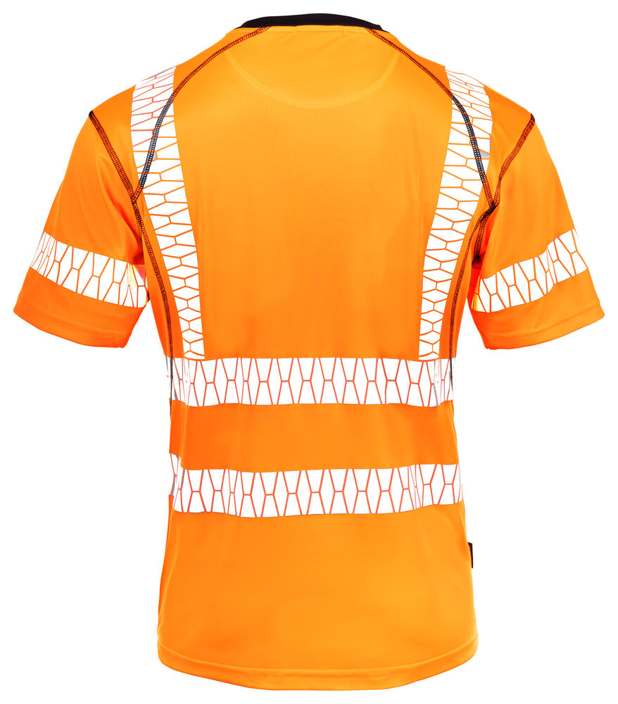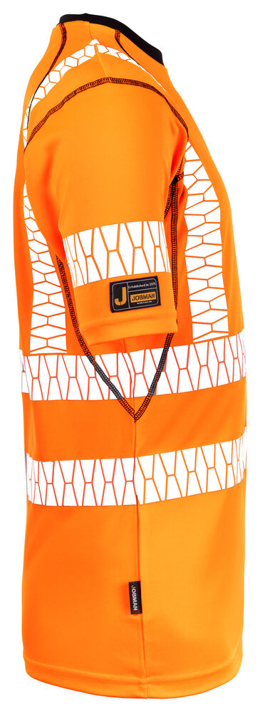 T-skjorte i permanent wicking-polyester som transporterer bort fukt fra huden og holder deg tørr. Stoffet er spesielt utviklet for å beskytte mot solens ultrafiolette stråler, sertifisert UPF 40+. T-skjorten har god passform som gir god bevegelsesfrihet. Svarte detaljer i halsutringningen gjør smuss mindre synlig. Flatlock-sømmer i svart og trykt etikett i nakken. Påvarmede reflekser uten sømmer i Jobman-design. Reflekser på skuldrene for økt synlighet.