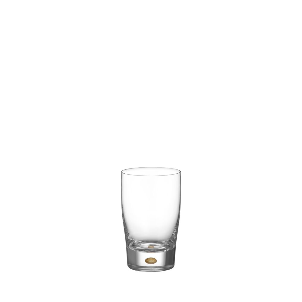 Våre håndverkere og Erika Lagerbielke har lenge forsøkt å fylle Intermezzos karakteristiske boble med gullpigment. Endelig er den der, bakt inn i det krystallklare glasset – en matt gullskimrende dråpe. Tumleren rommer 25 cl og er et universalglass som passer til et bredt utvalg av drikker. Glasset egner seg spesielt godt til bordvann, spesielt sammen med vinglass. Glasset er munnblåst i Sverige av våre dyktige glassblåsere. Designet av Erika Lagerbielke.