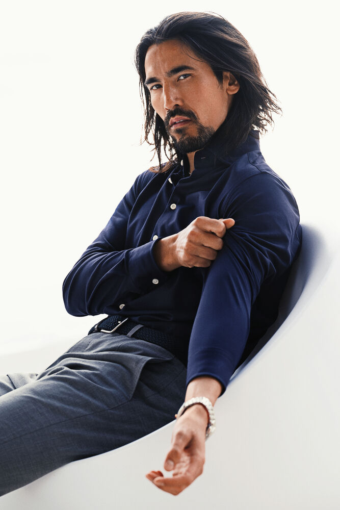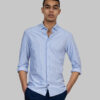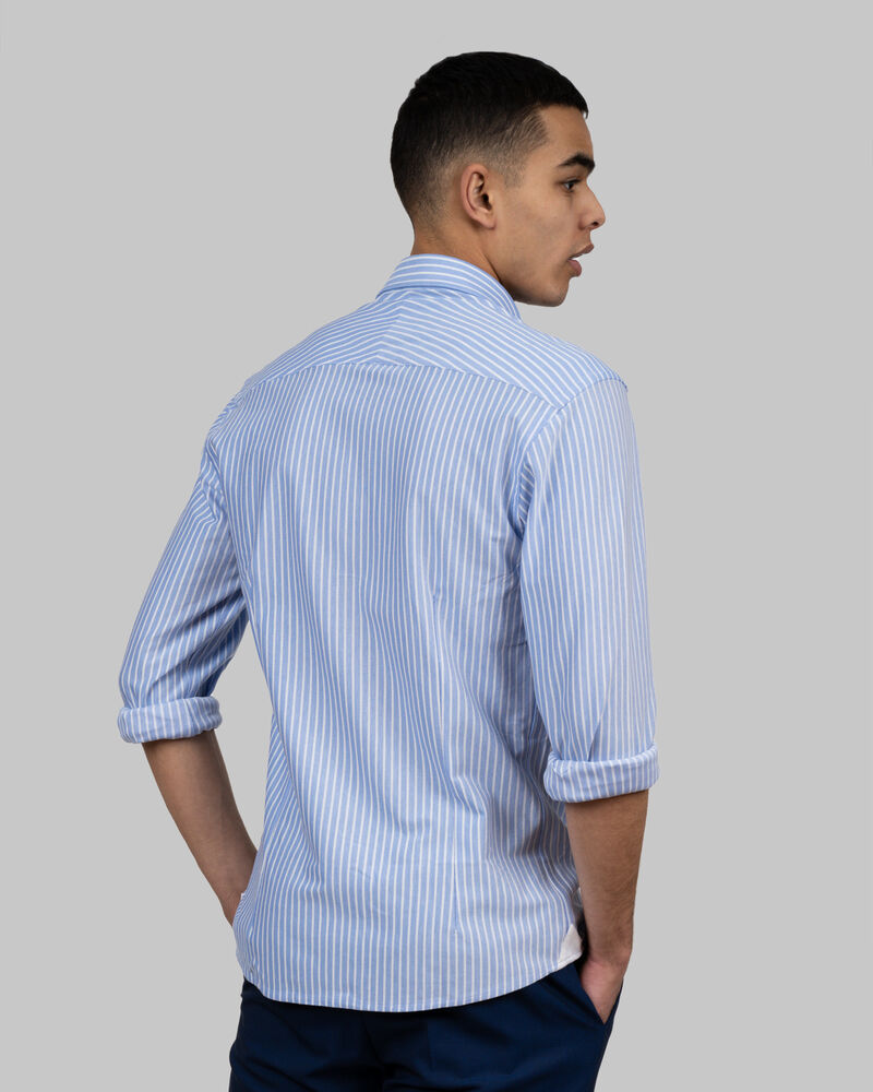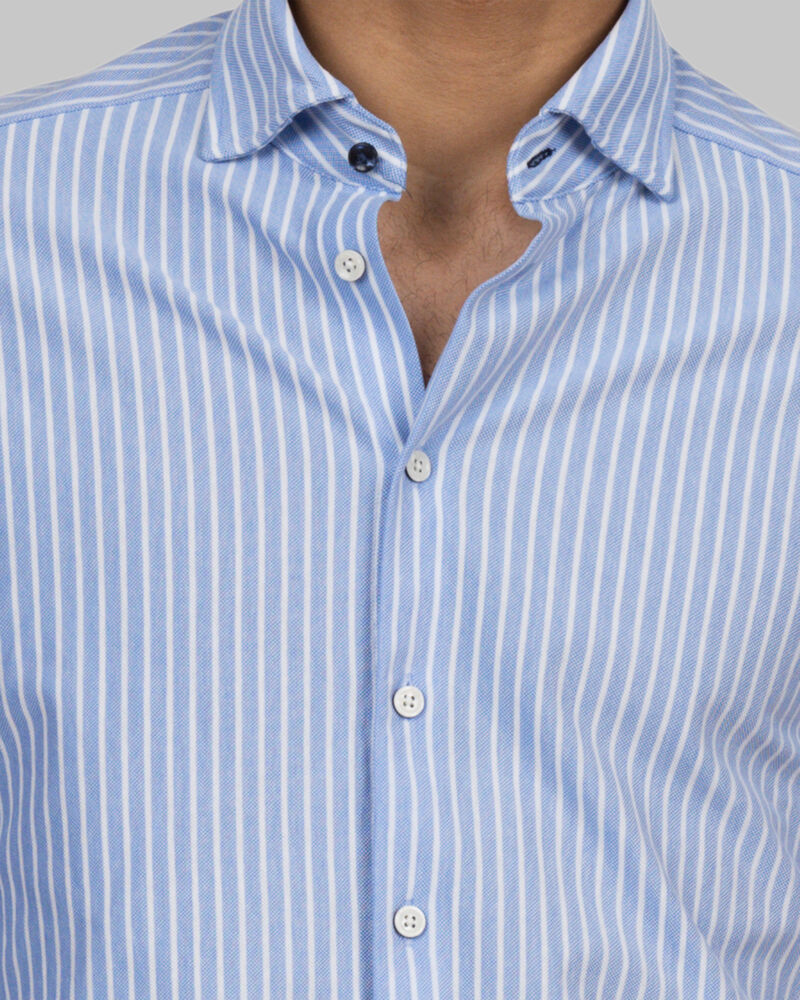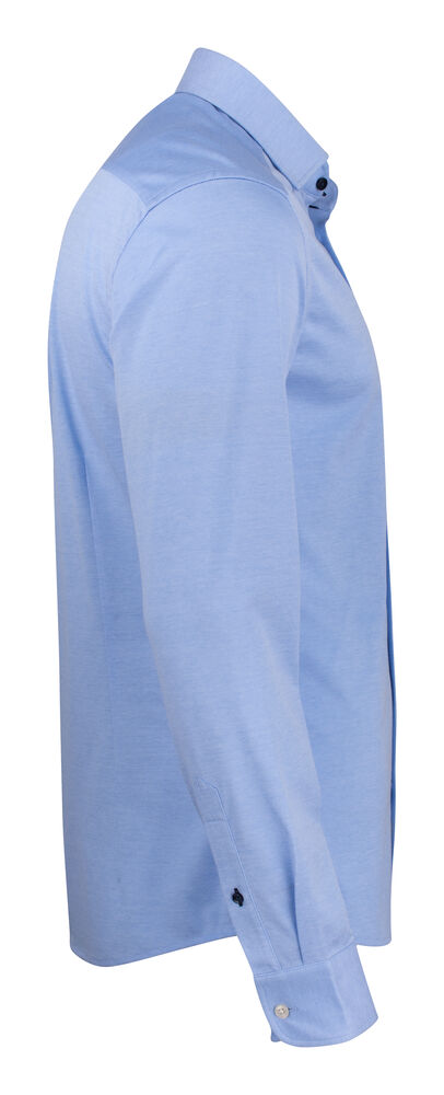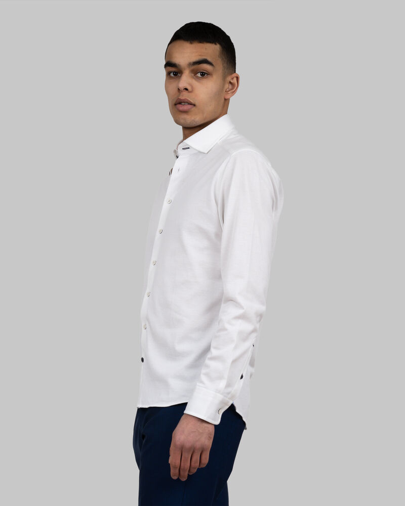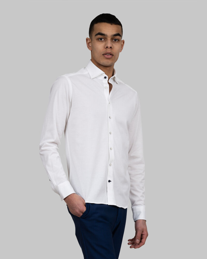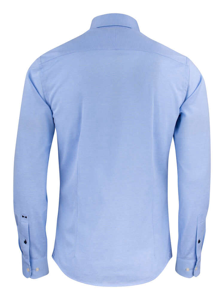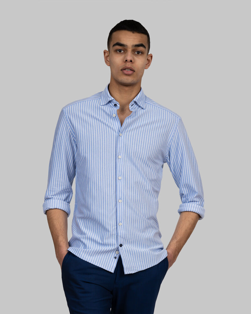 Indigo Bow 34 ser ut som en klassisk, vevd finskjorte – men er faktisk en strikket skjorte. Å ha på seg skjorten føles nærmest som å ha på seg en t-skjorte da den gir en utrolig komfort!