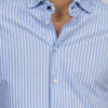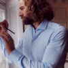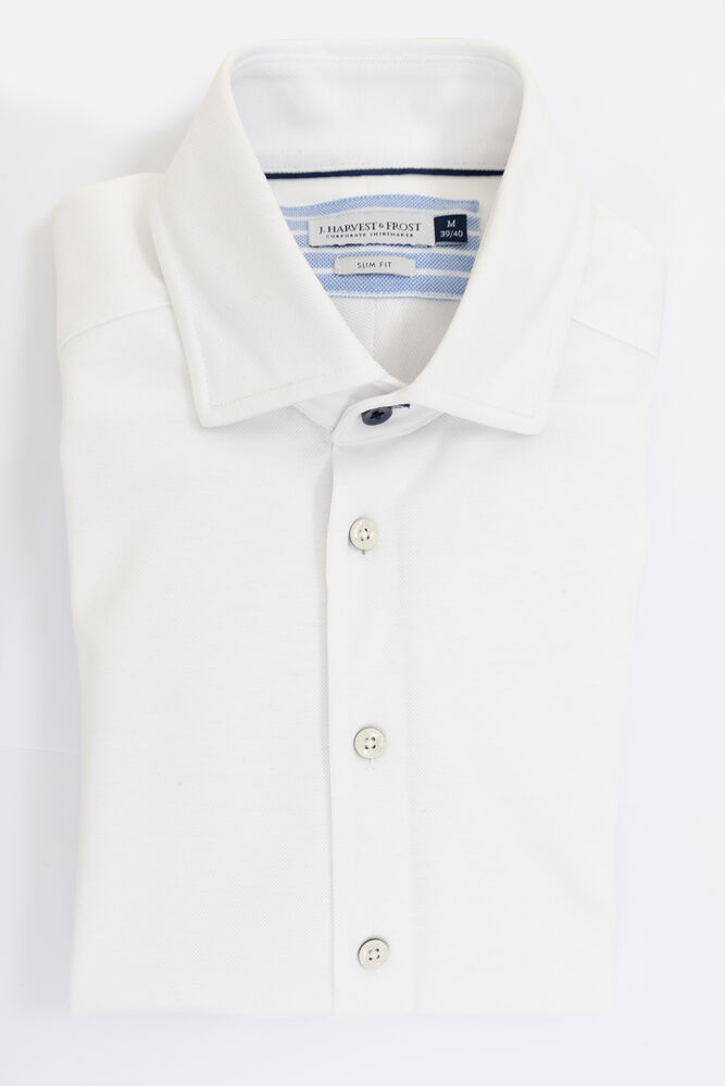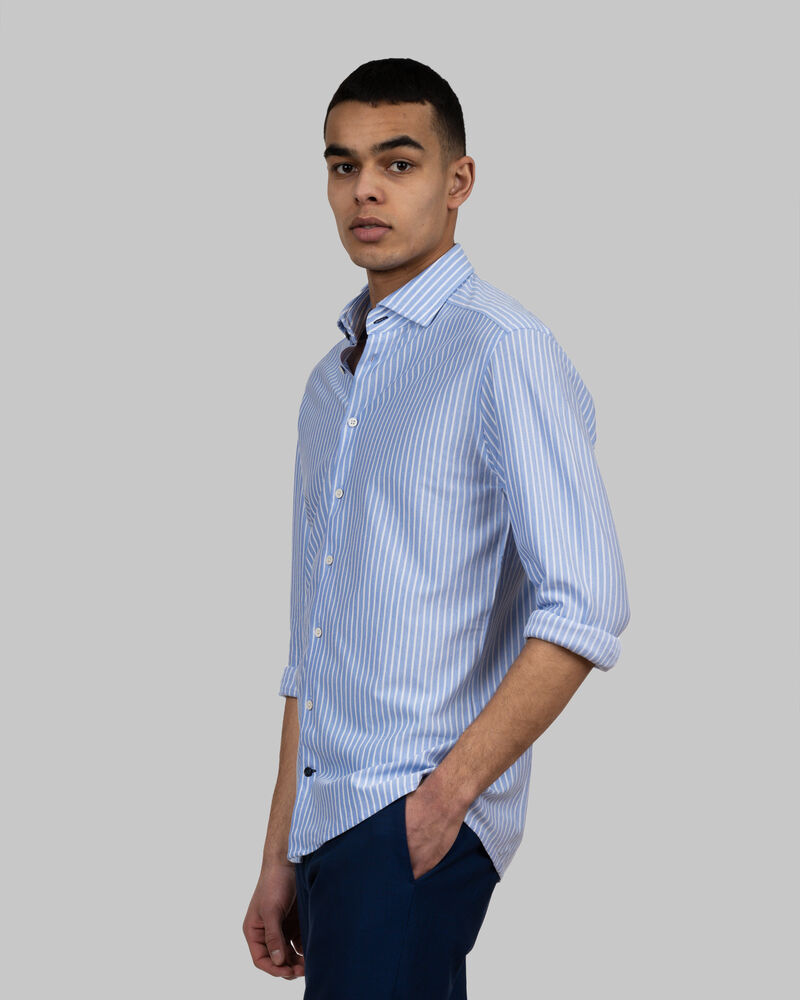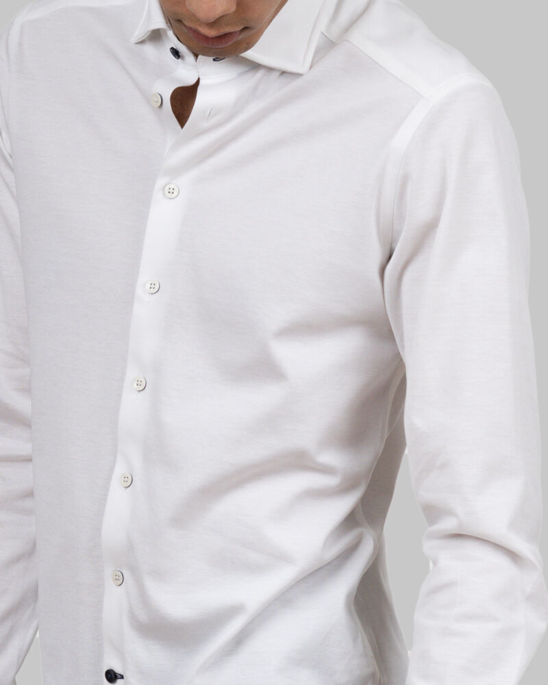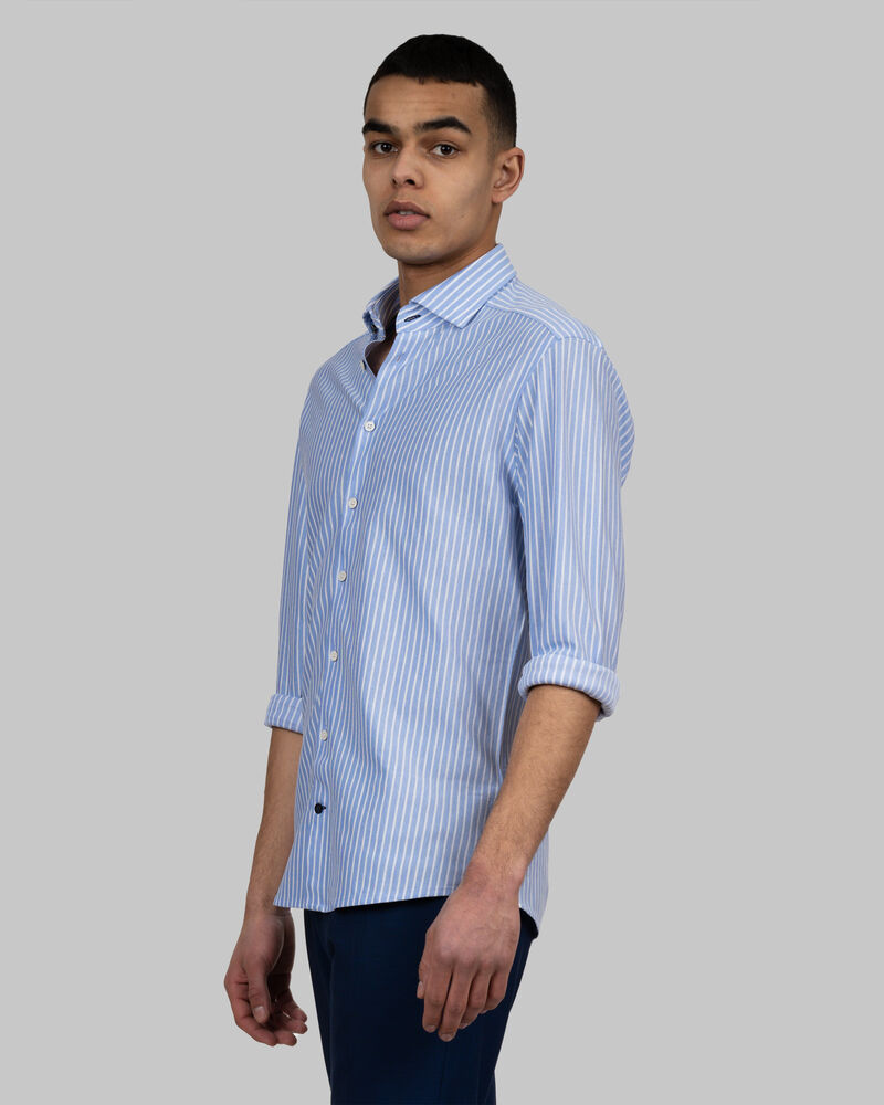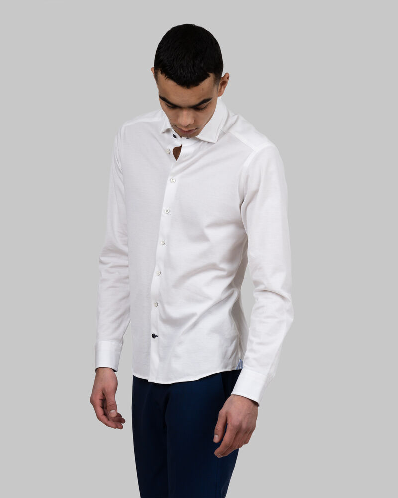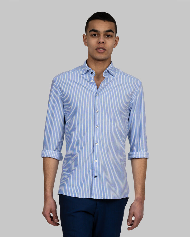 Dette oppnår vi ved å bruke high-end dobbel 60 kompakt garn, sammen med en myk behandling, noe som gir skjorten en luksuriøs glans og silkeaktig følelse. Når du bruker garn av høy kvalitet i et strikket stoff, får du også en naturlig strykefri funksjon, så det er bare å vaske den, henge den opp og ta den i bruk. Kragen er myk og har skjult button-down. Indigo Bow 34 ser ut som en klassisk, vevd finskjorte – men er faktisk en strikket skjorte. Å ha på seg skjorten føles nærmest som å ha på seg en t-skjorte da den gir en utrolig komfort!