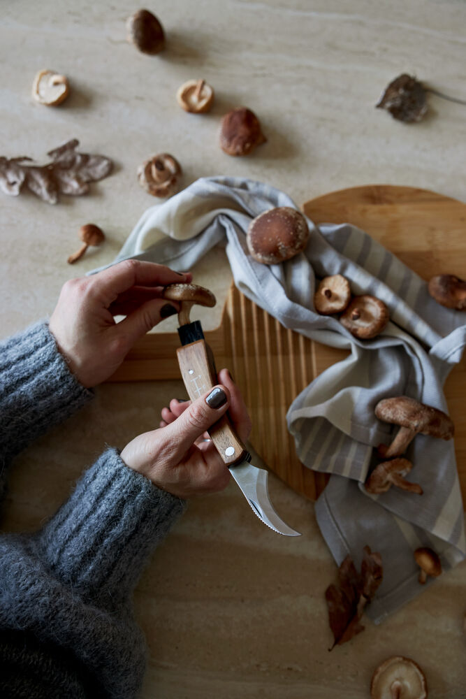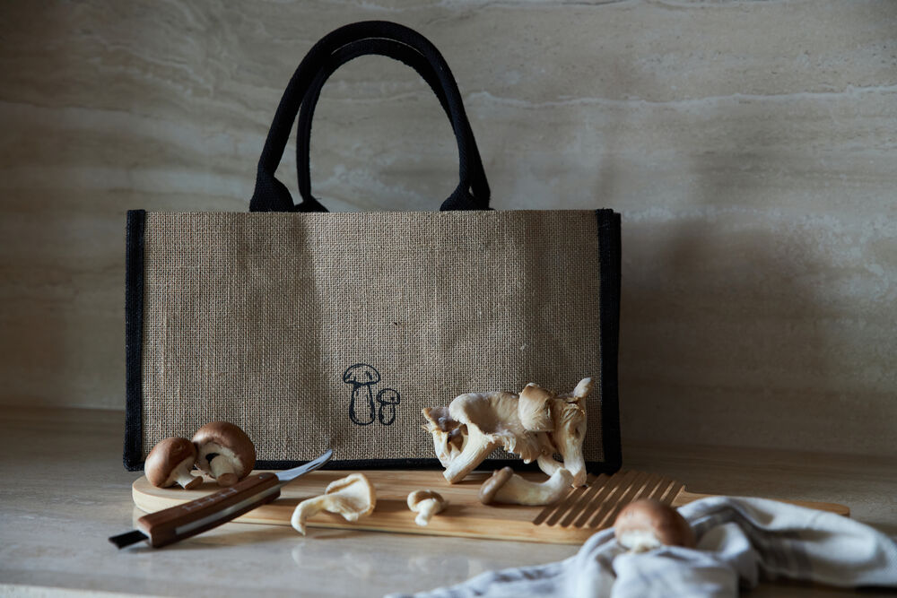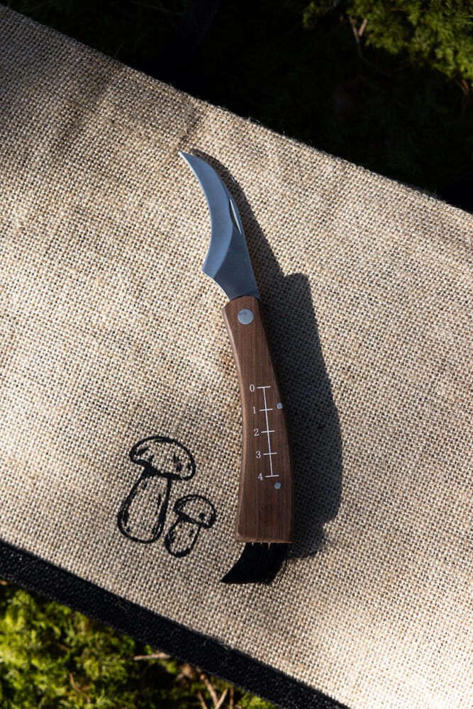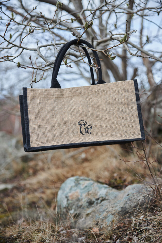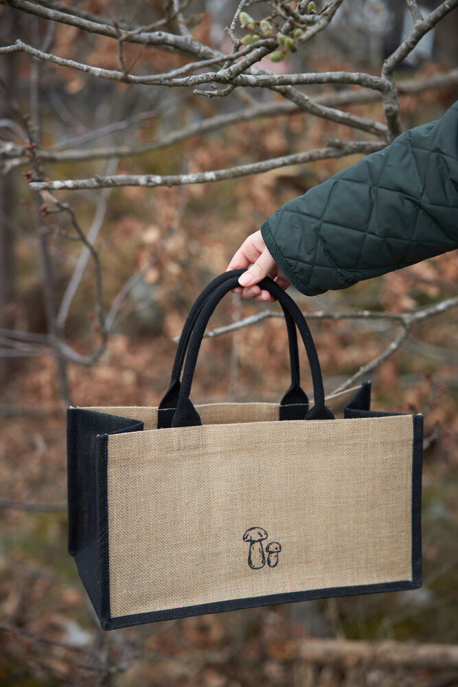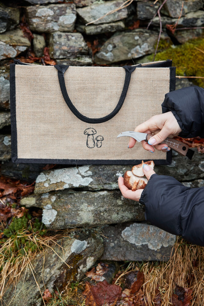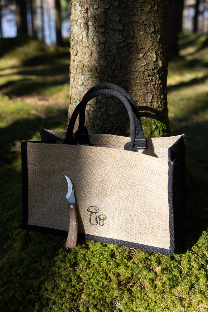 Praktisk, enkel og sammenleggbar soppveske med soppkniv. En kurv og veske i ett. Innsiden har en liten lomme hvor den medfølgende sammenleggbare soppkniven kan oppbevares. Posen er laget av jute med vokset innside som gjør den enkel å rengjøre. Fargene er nær naturen. Denne vesken er et must for alle som begir seg ut på sopptur.