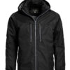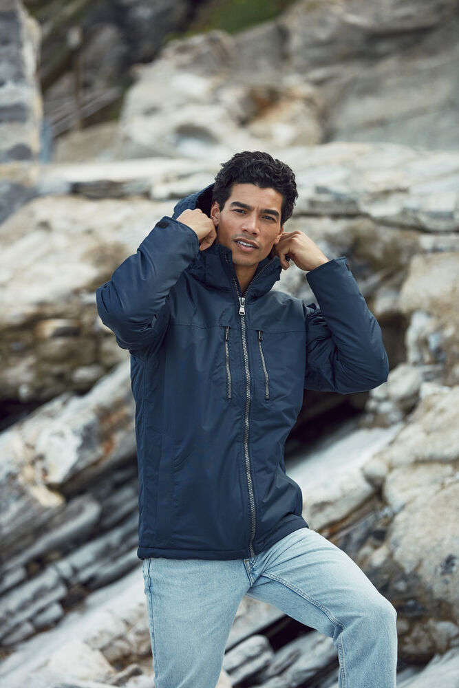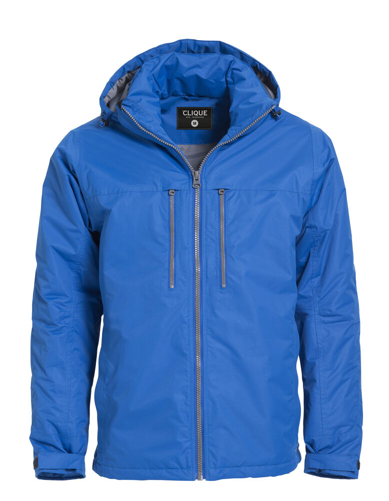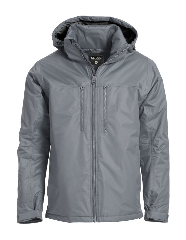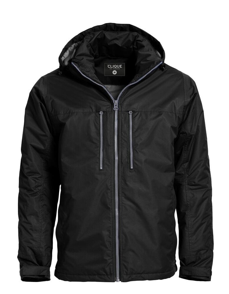 Fôret, vind- og vanntett jakke. Fire ytterlommer med glidelås, en innvendig lomme med glidelås og to innvendige mesh lommer. Avtagbar hette og skjulte mansjetter nederst på armene. Tilpasset for hodetelefoner. Kommer med broderingslomme. W/P 3000 MVP 3000.
