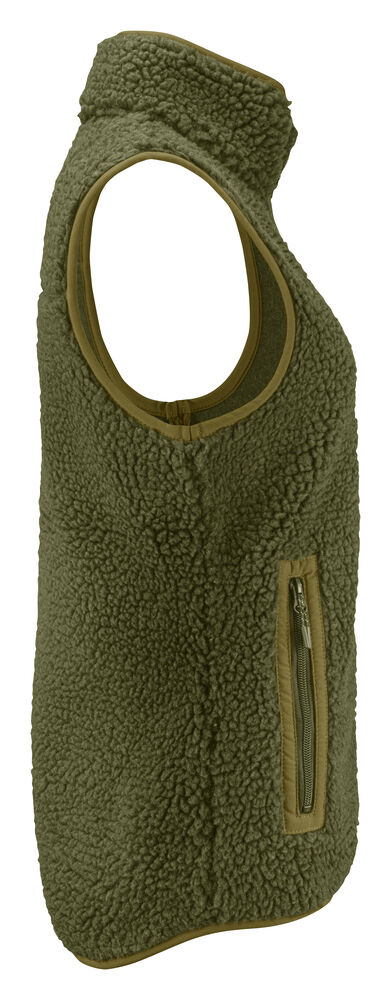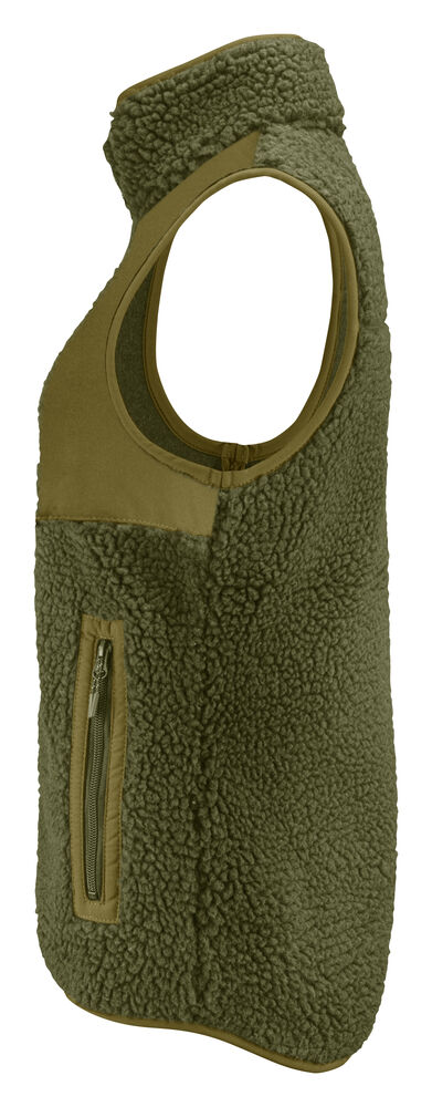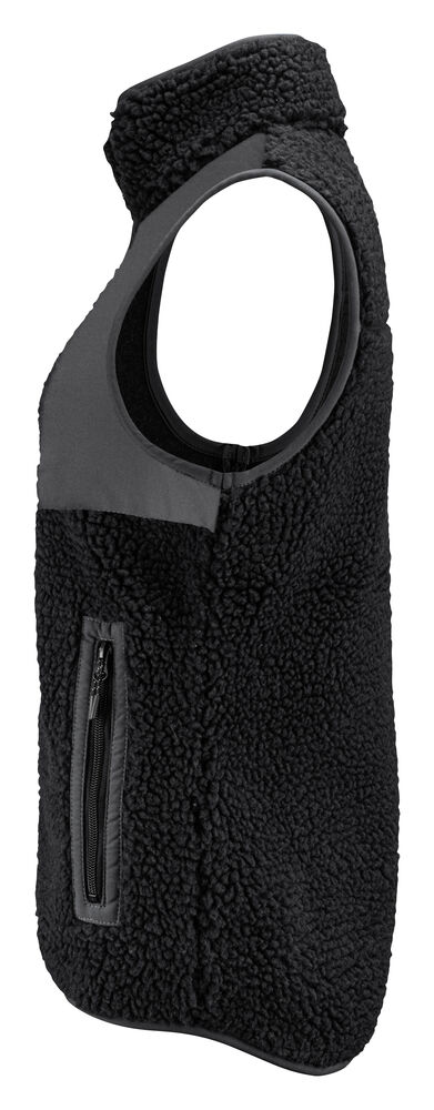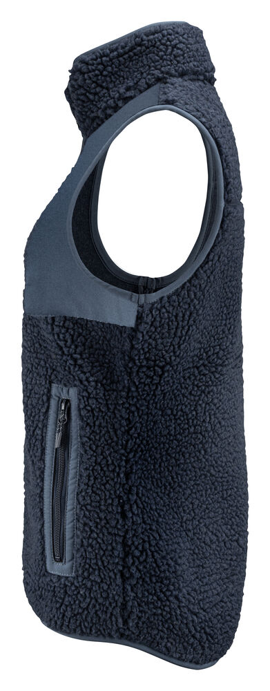 Tofarget fleecevest med kontrastmateriale på brystet, samt passepoil langs kanten på sømmene. Brystlomme og sidelommer med glidelås. Fleecevesten er pakket i en komposterbar polypose.