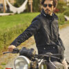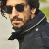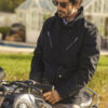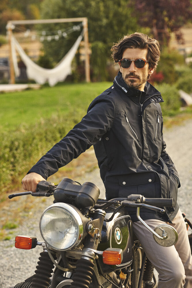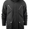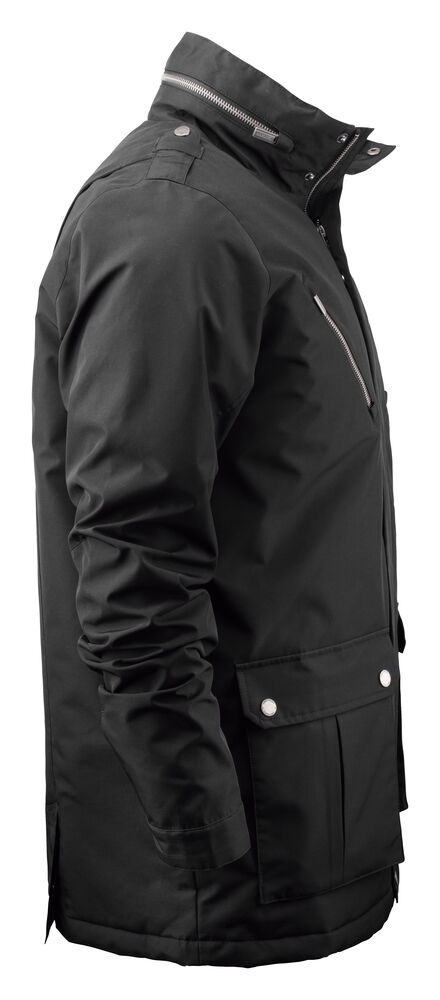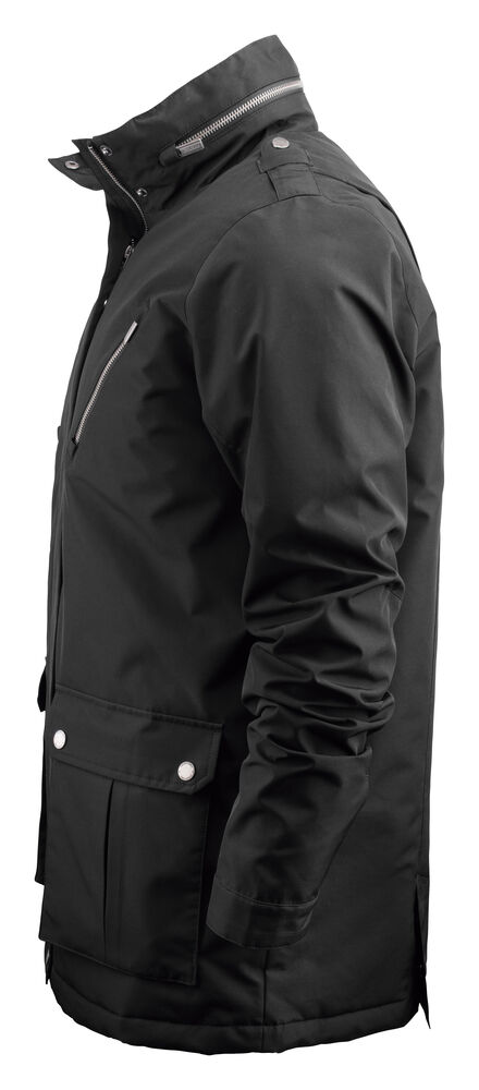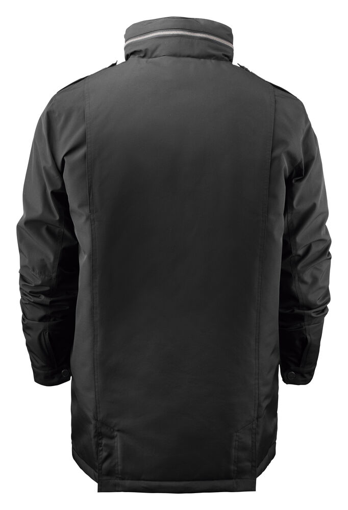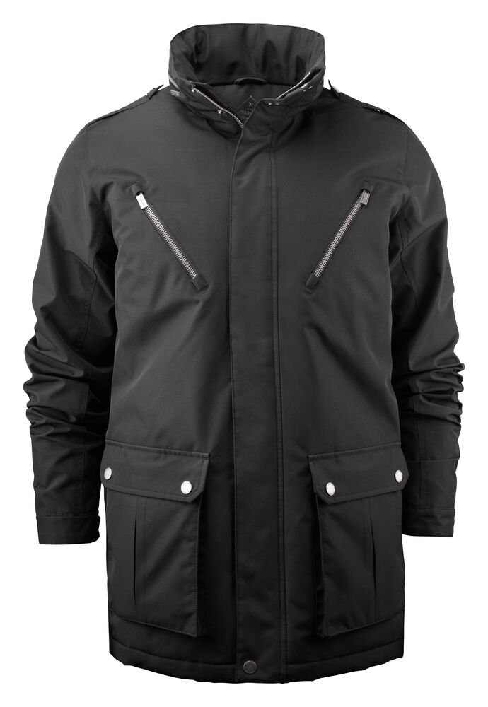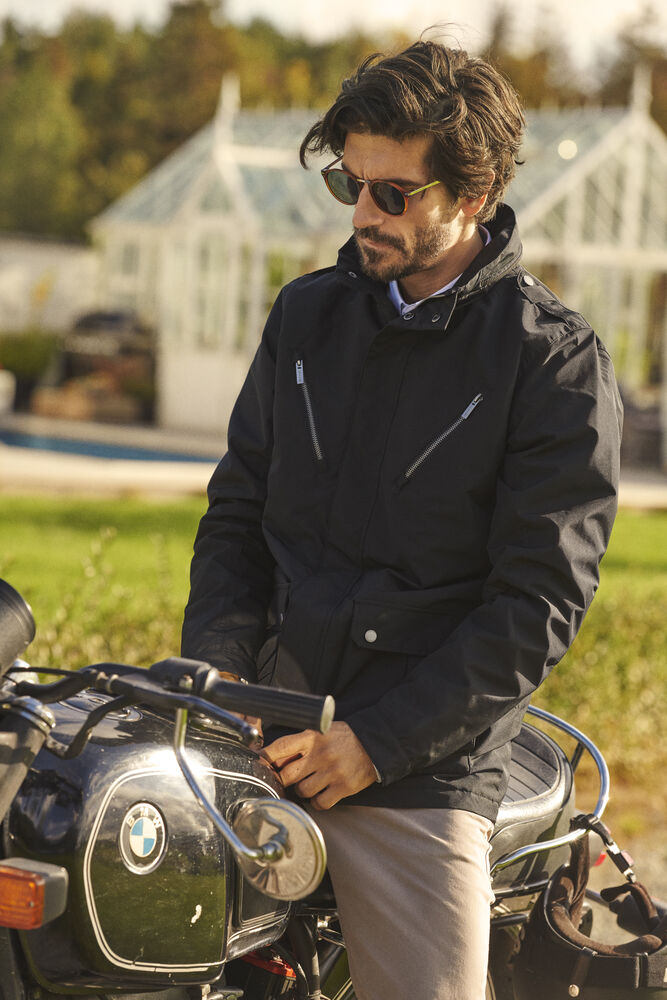 Lett vattert jakke med hette i kragen. Fire lommer i front på jakken.