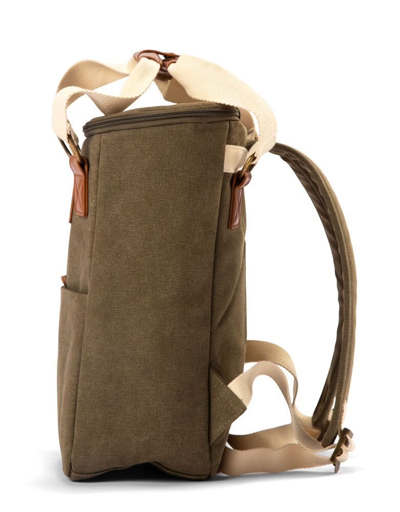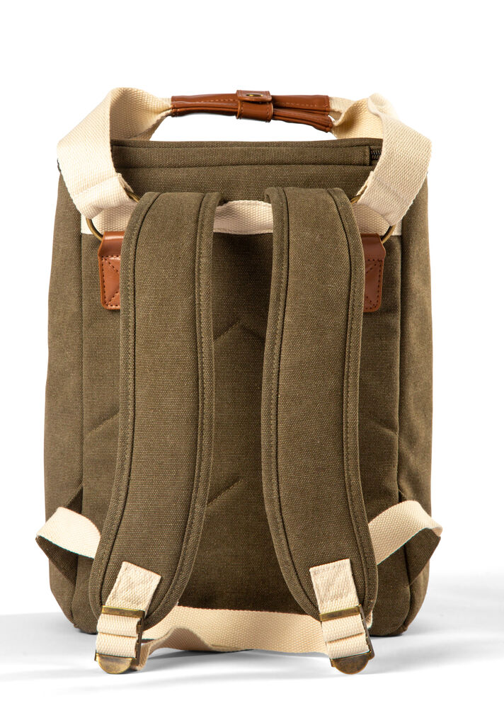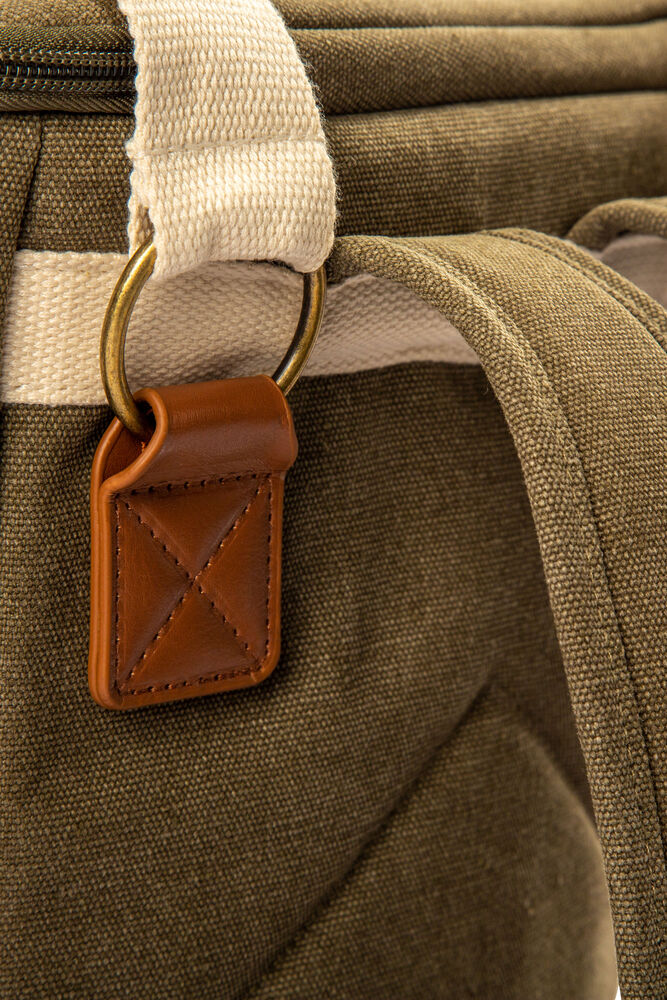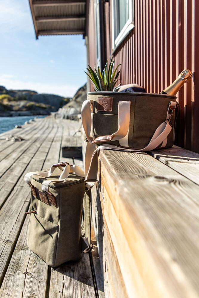 Mindre kjøleryggsekk fra Orrefors Hunting. Hendig kjøleryggsekk som kan inneholde for eksempel en flaske bobler, frukt og termos. Sekken er en mindre variant av 410847. Utside i slitesterk bomullskanvas med solide håndtak som kan settes sammen med knapp, justerbare skulderstropper. På fronten er det en liten lomme som lukkes med glidelås.