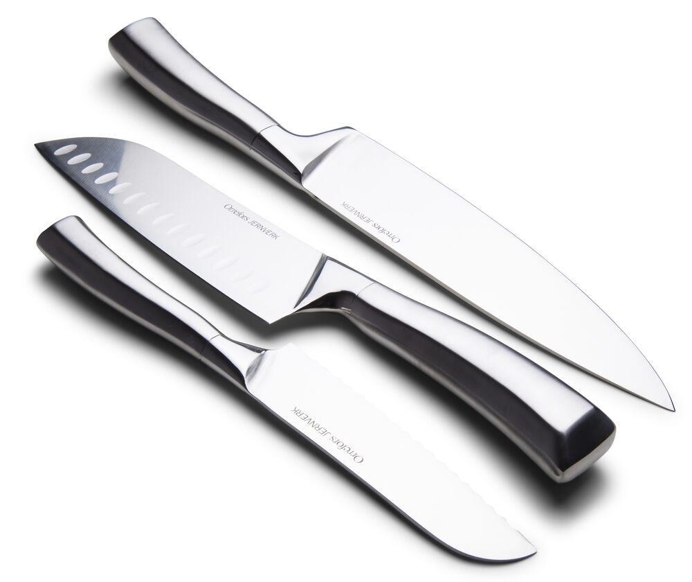 Et svært anvendelig og eksklusivt knivsett med tre kniver; Japansk kokkekniv, kokkekniv og tomatkniv.