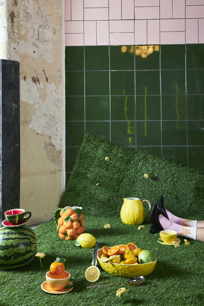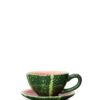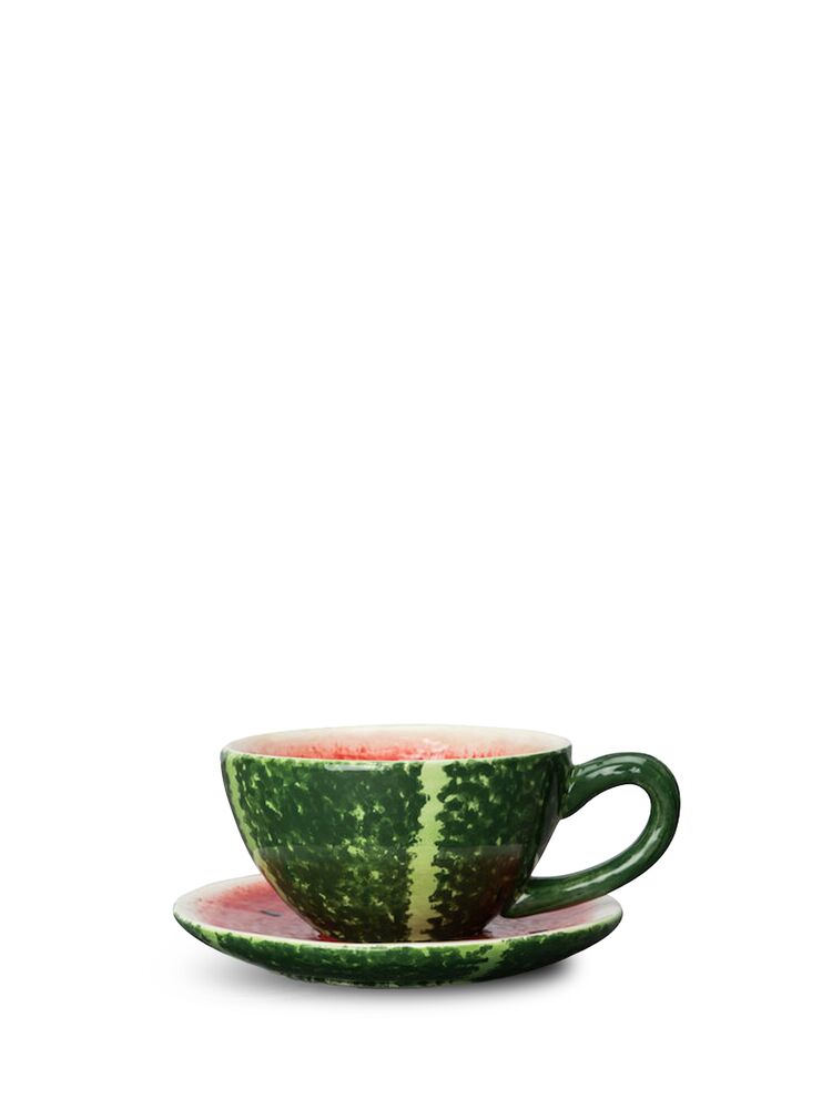 Kopp Watermelon er en te- eller kaffekopp med tilhørende tallerken formet etter sitt navn. En del av Byons fruktkompott og tilhører Fruity-serien. Leveres i fin gaveeske med kopp og fat i ett. Tåler vask i oppvaskmaskin. Design Byon Studio.