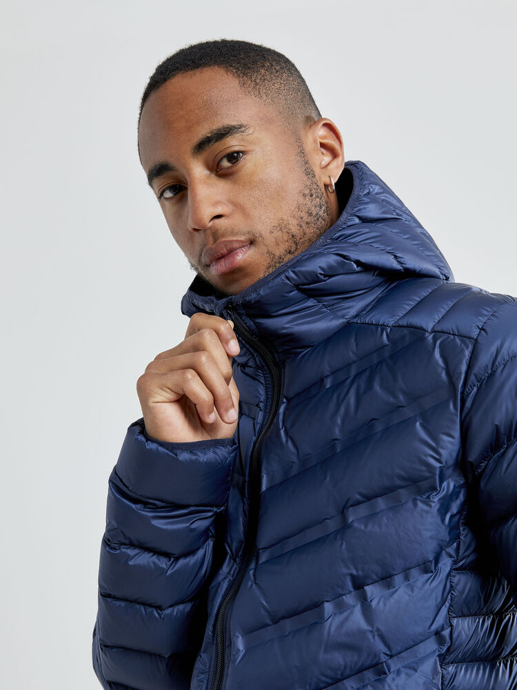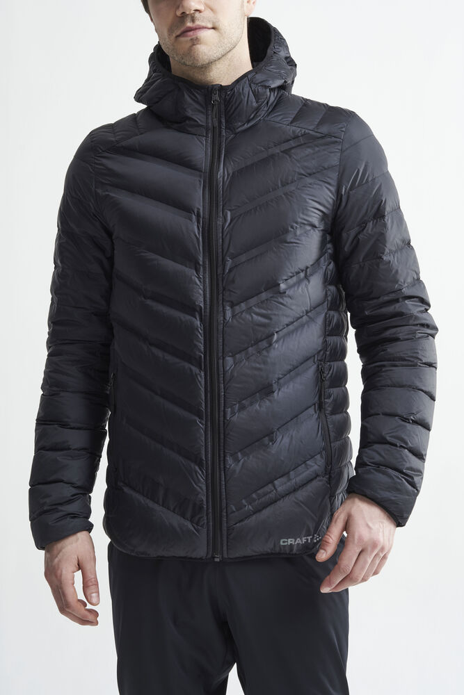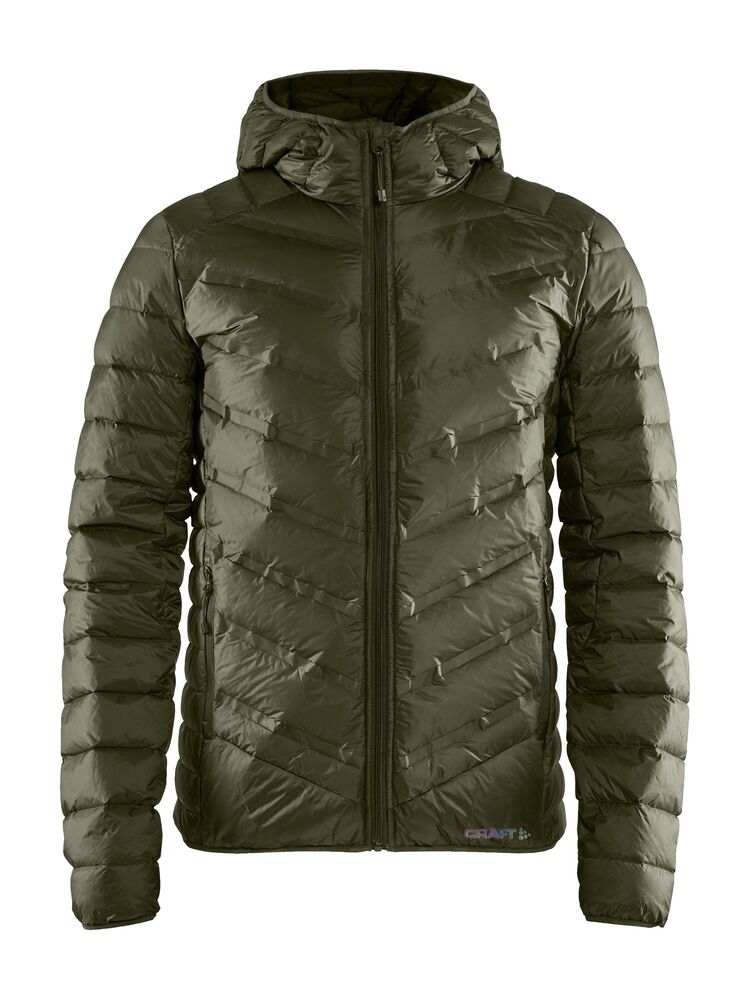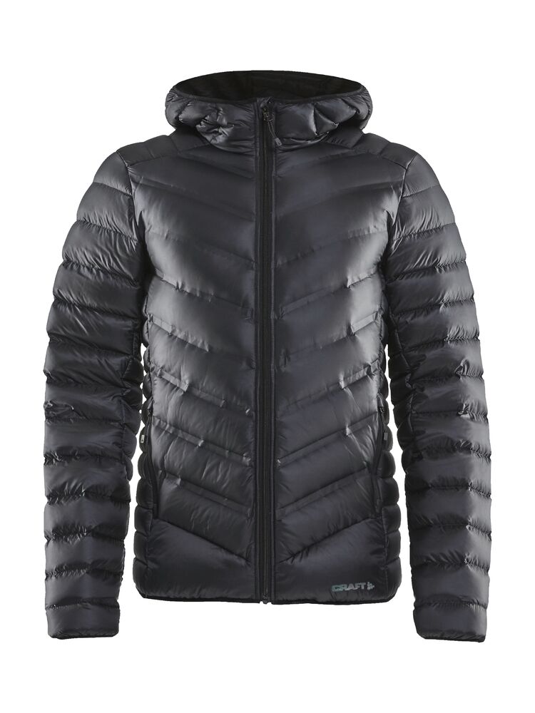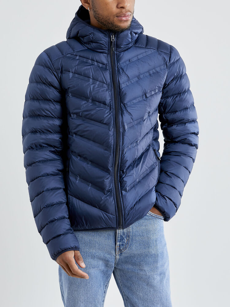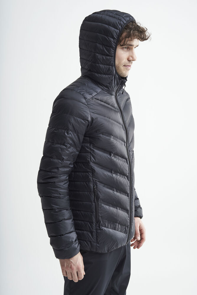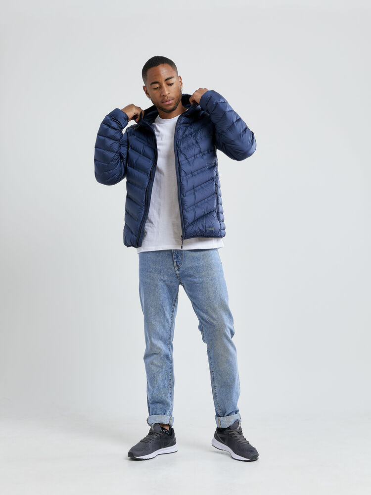 Lett dunjakke med limte kanaler, formet hette og to sidelommer med glidelås.