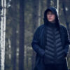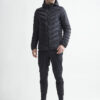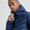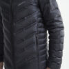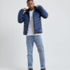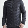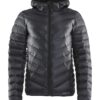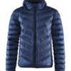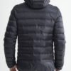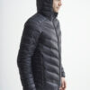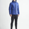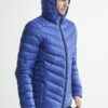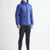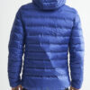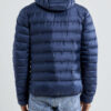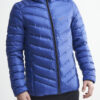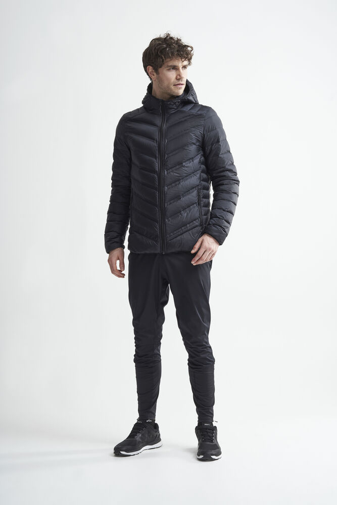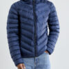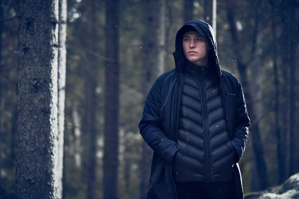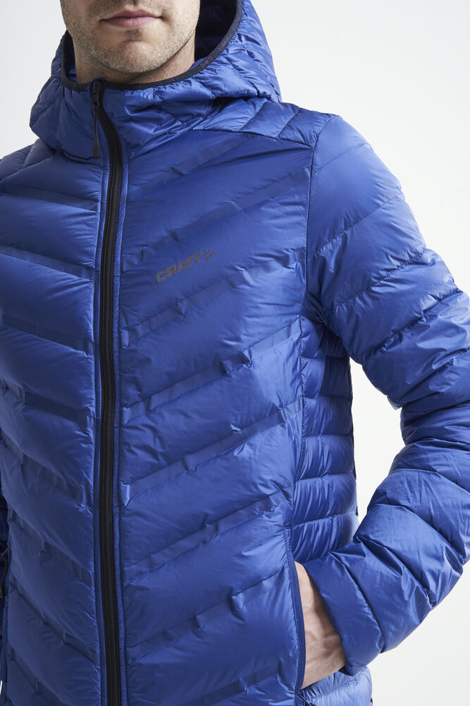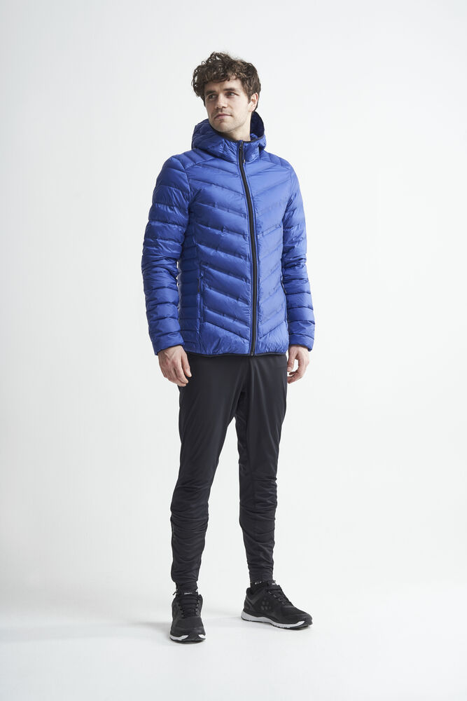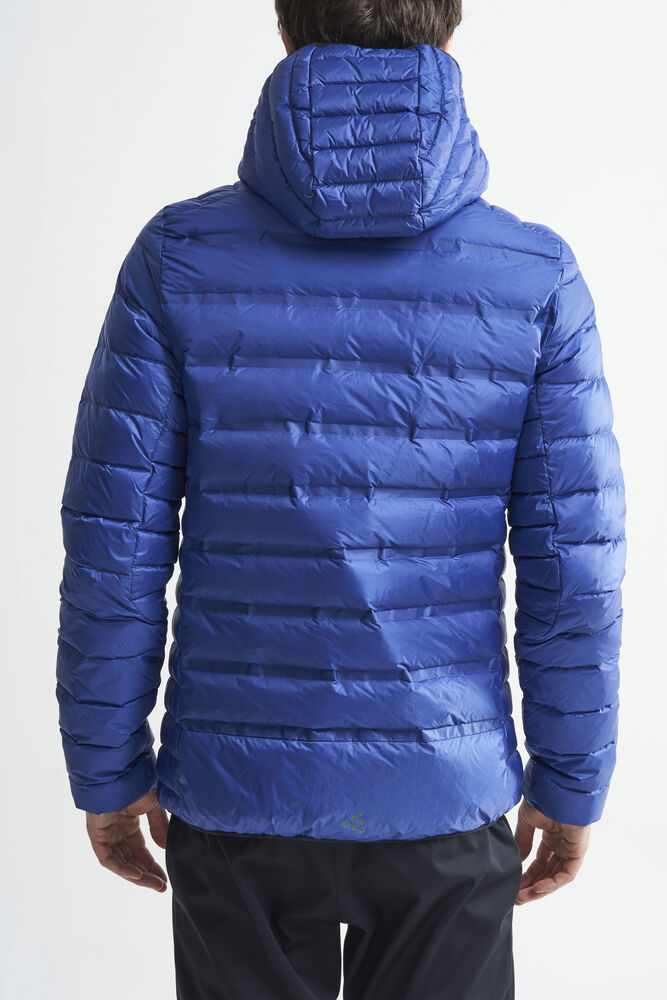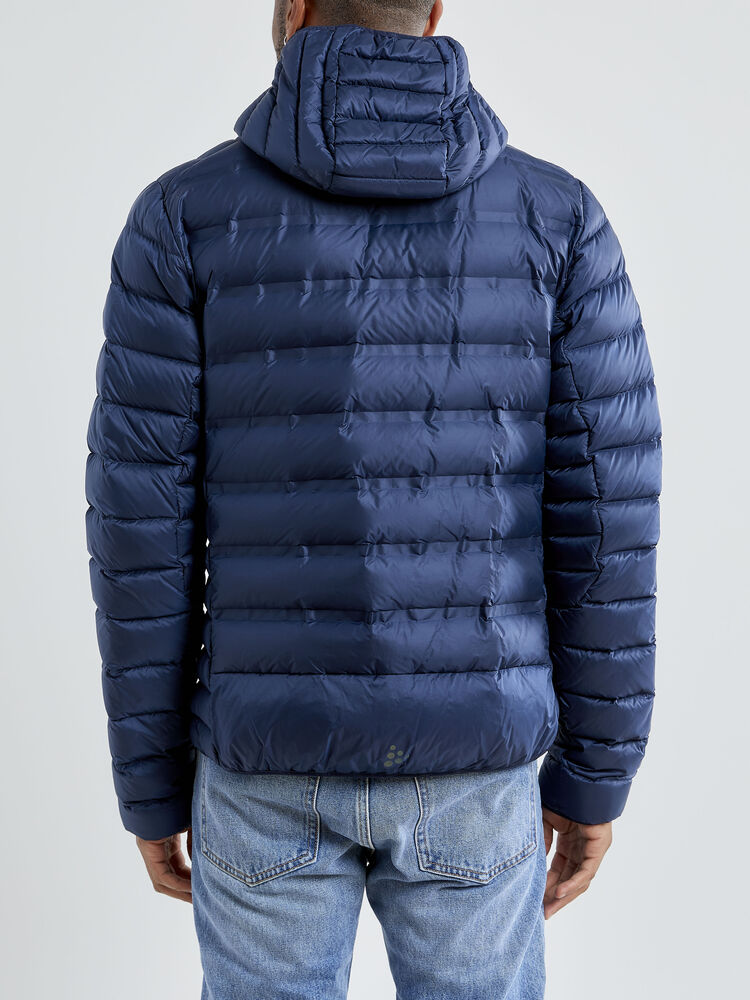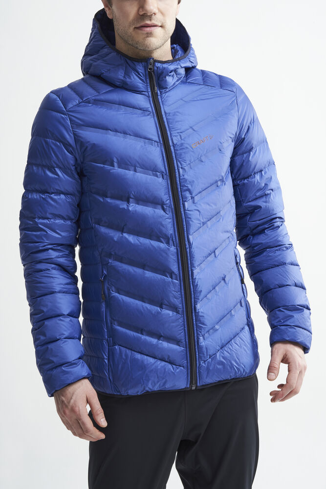 Lett dunjakke med limte kanaler, formet hette og to sidelommer med glidelås.