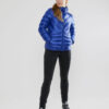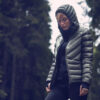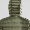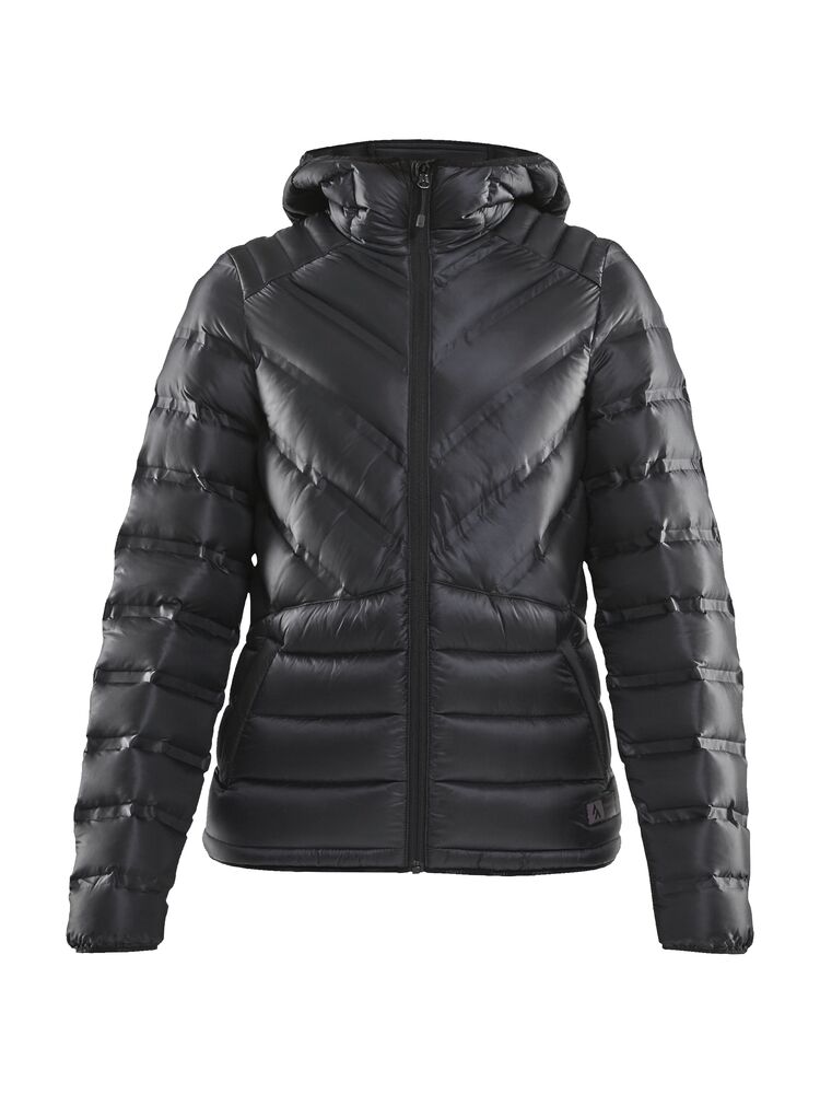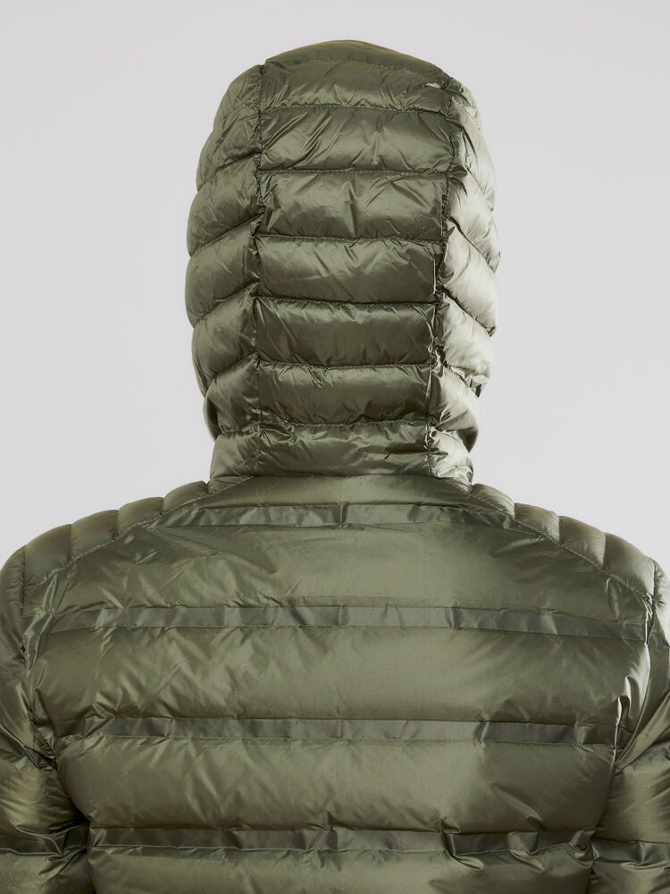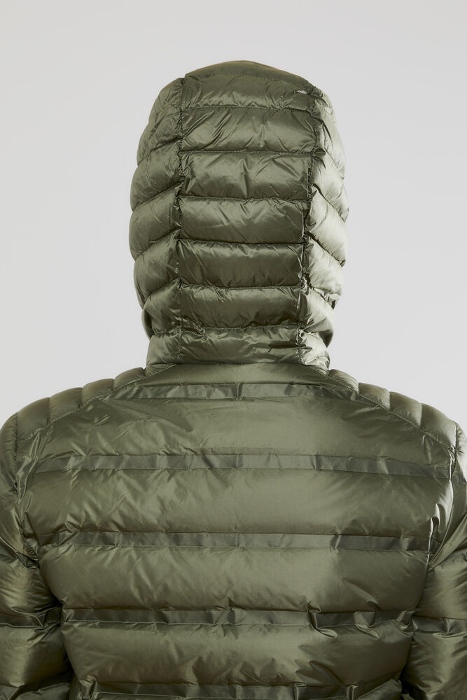 Lett dunjakke med limte kanaler, formet hette og to sidelommer med glidelås.