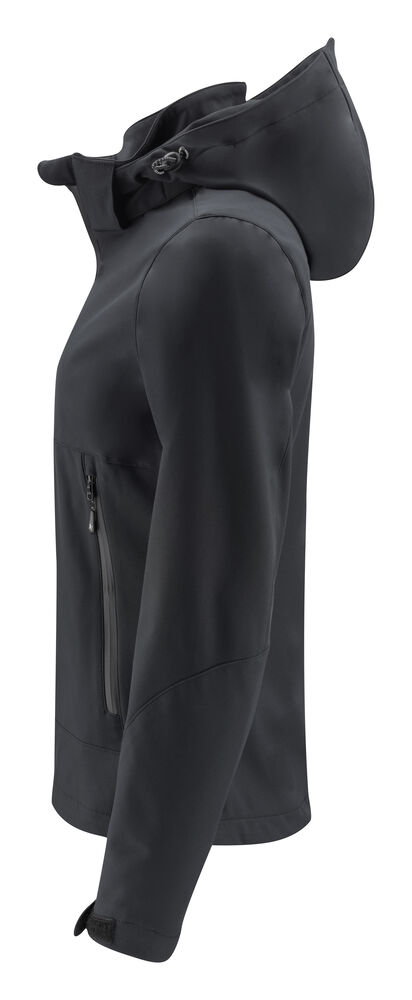 Vind- og vannavvisende softshelljakke. Vanntett glidelås i front og på sidelommene. Innerlomme med glidelås på venstre side. Avtagbar hette. Justerbar borrelåslukking nederst på ermene. Hette kan justeres med elastiske snorer. Skjult broderingslomme med glidelås på innsiden.