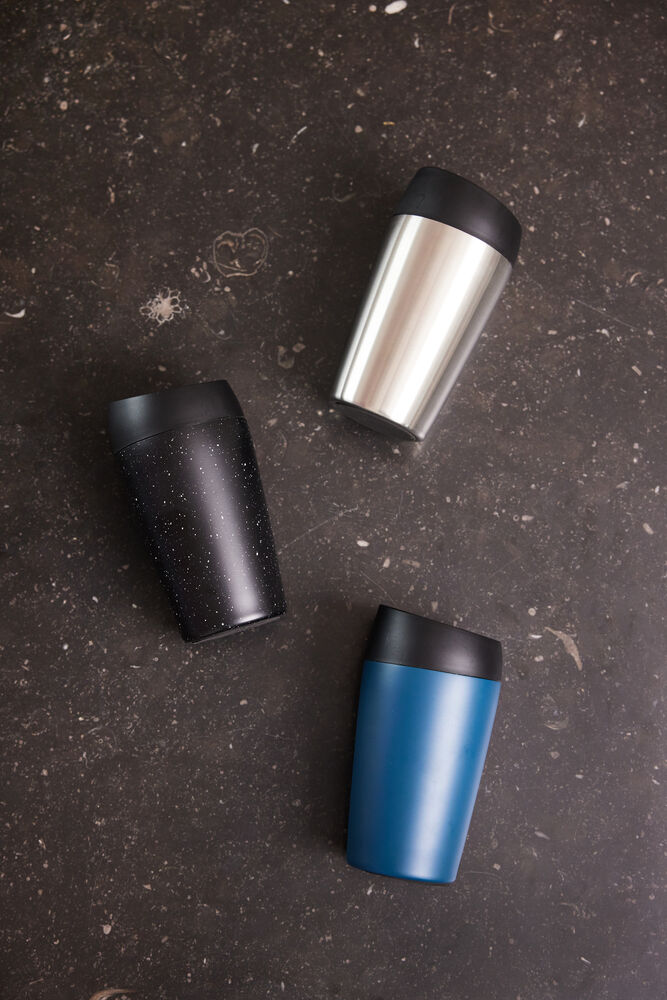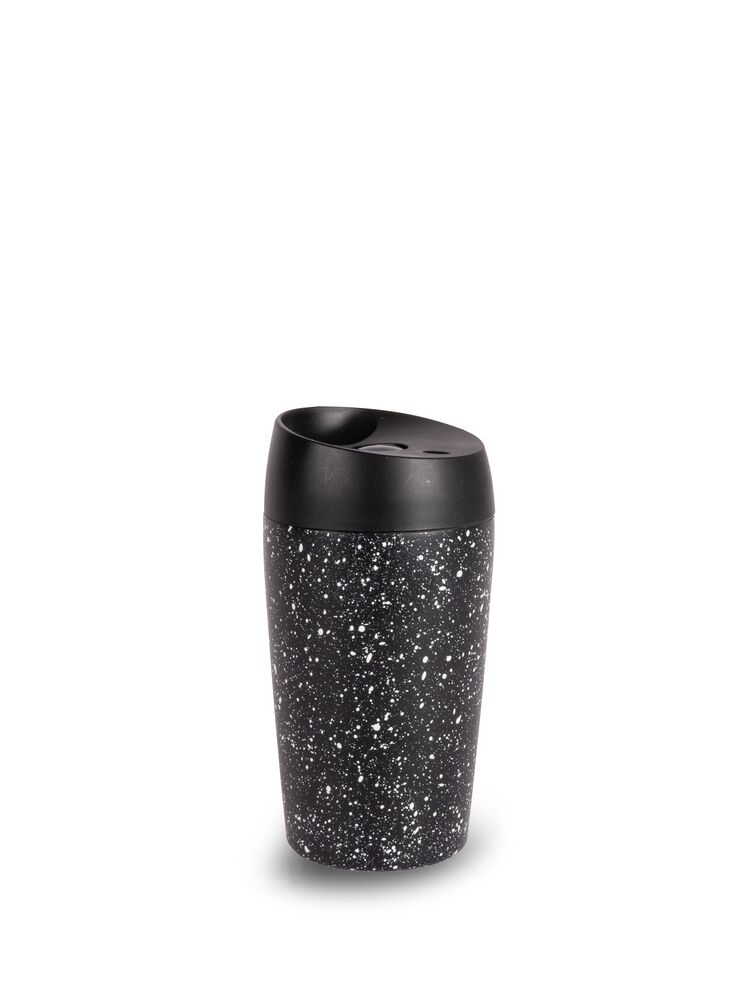 Loke i sort med hvitt sprutmønster, et bilkrus som vi elsker for variasjon, fargevalg og konstruksjon. Loke er en serie produkter som har som formål å forenkle hverdagen. Loke rommer 24 cl og kan enkelt plasseres under kaffemaskinen for påfylling. Kruset har doble vegger for å holde drikken varm lenger. Men det beste av alt er at det ikke er noen lekkasje takket være en smart låsefunksjon.
