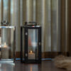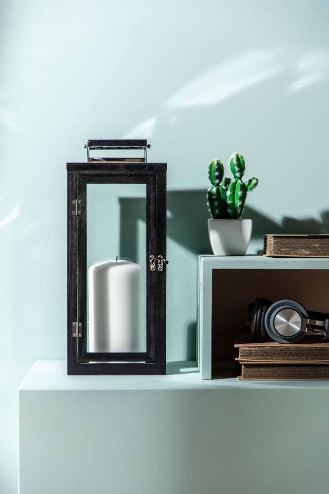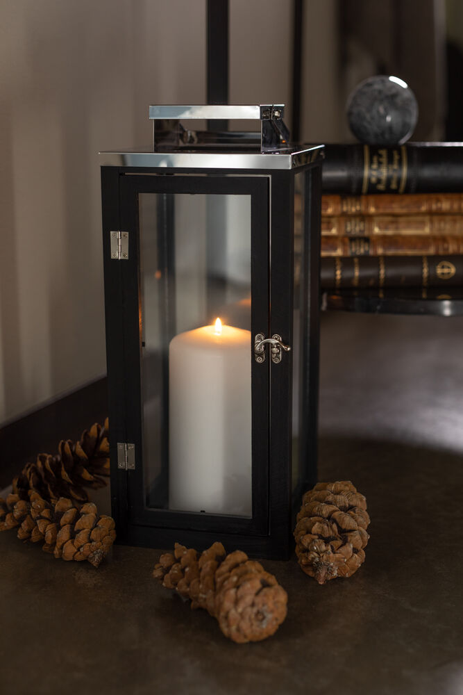 Sort, robust trelykt fra Orrefors Jernverk. Lykten består av malt furu med rustfrie detaljer og glassvegger. Åpnes og lukkes med en dekorativ krok foran. Lykten blir en stilig detalj i interiøret og skaper også en koselig glød. Lykten kan brukes utendørs under tak i varmere vær.