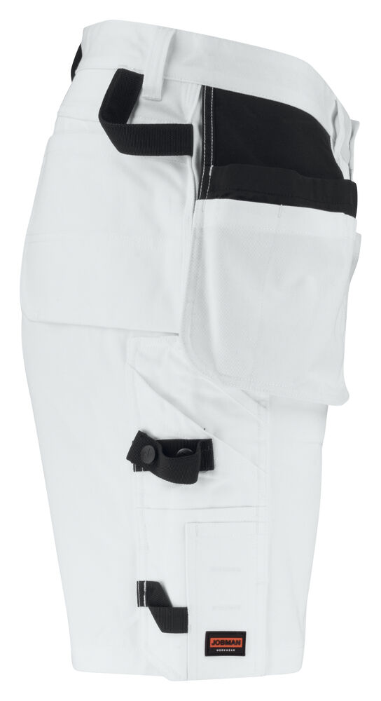 Malershorts med svært god passform og design utviklet for profesjonelle malere. Jobmans bomullstwill har gode egenskaper, den er slitesterk, absorberer maling og minimerer gjennomblødning. Shortsen har romslige hengelommer. Den indre lommen har vannavstøtende FA™-polyamidfôr på innsiden. Romslige front- og baklommer, benlomme med ekstra rom og glidelås, mobiltelefonlomme og ID-kortholder. Kniv- og tommestokklomme med praktiske rom for alle tenkelige maleverktøy. Shortsen har en løkke for kluter. Tåler vask på 85 grader.