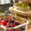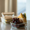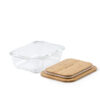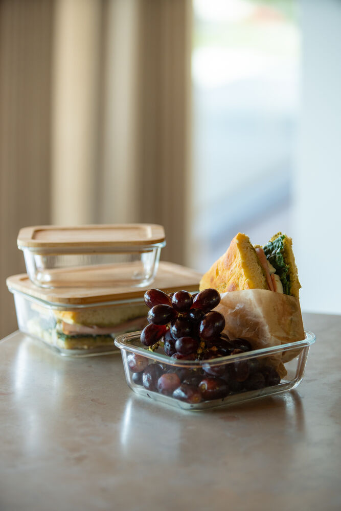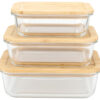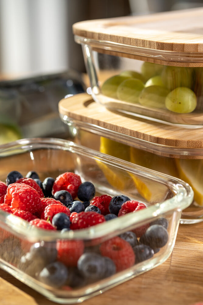 Matbokser i glass levert som sett med tre bokser. Trelokket er laget av bambus og har en gummilist som gjør at den enkelt kan forsegles på nytt. Matboksene kan maskinvaskes, stables, brukes i mikrobølgeovn, stekeovn eller i kjøleskap. Det er stor overflate for profilering på lokket.