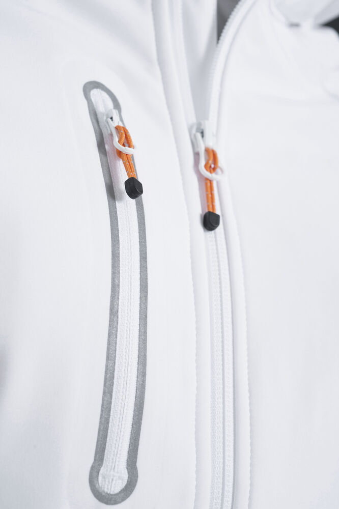 Softshelljakke med to sidelommer, reflekterende piping rundt brystlomme, to innerlommer. Avtagbar hette. Justerbar ermavslutning og snor i nederkant. TPU membran og fleece. WP3000/MVP3000.