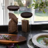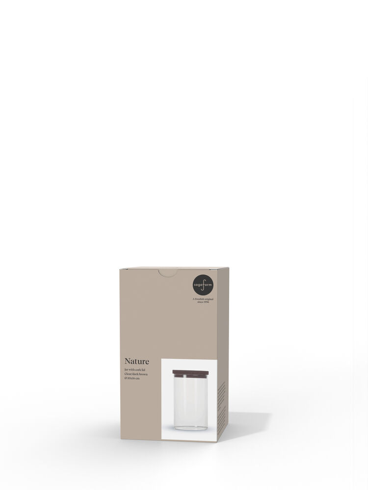 Glasskrukke med mørkebrunt korklokk. En nydelig og klassisk kombinasjon som aldri går av moten. Disse krukkene oppbevarer tørrvarer som müsli, mel eller pasta på en ryddig og vakker måte. De egner seg også til barneleker eller til bomullspad på badet. Krukkene egner seg utmerket til stabling. Tilgjengelig i to størrelser. Krukkene er munnblåst og kan dermed variere noe i størrelse.