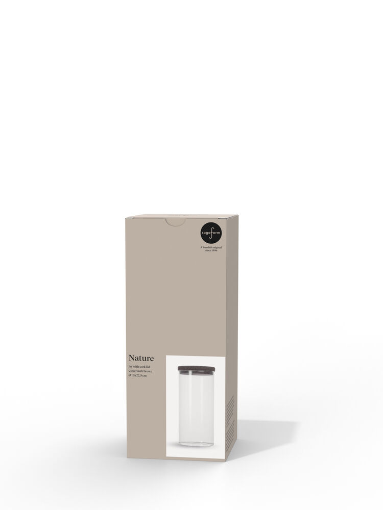 Glasskrukke med mørkebrunt korklokk. En nydelig og klassisk kombinasjon som aldri går av moten. Disse krukkene oppbevarer tørrvarer som müsli, mel eller pasta på en ryddig og vakker måte. De egner seg også til barneleker eller til bomullspad på badet. Krukkene egner seg utmerket til stabling. Tilgjengelig i to størrelser.