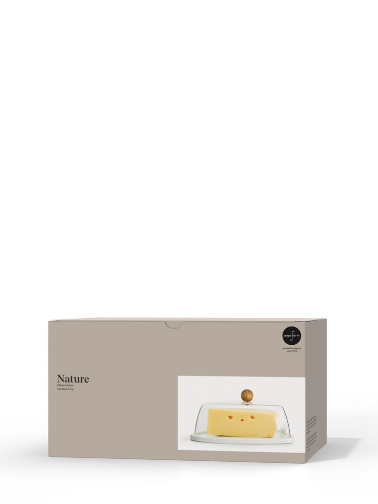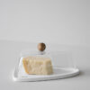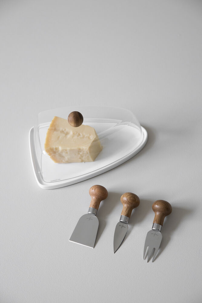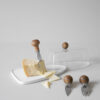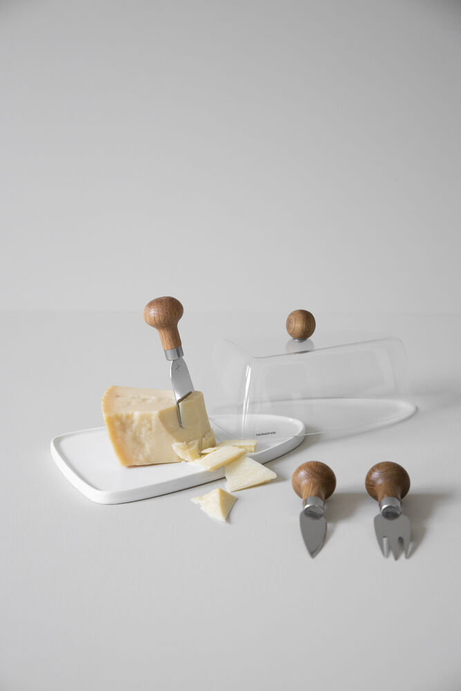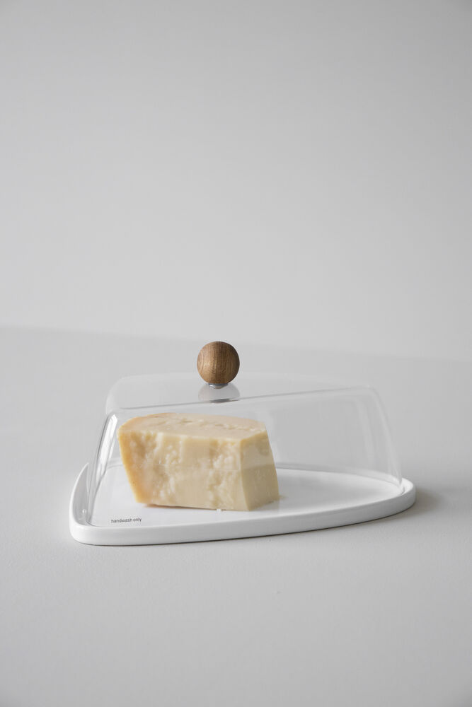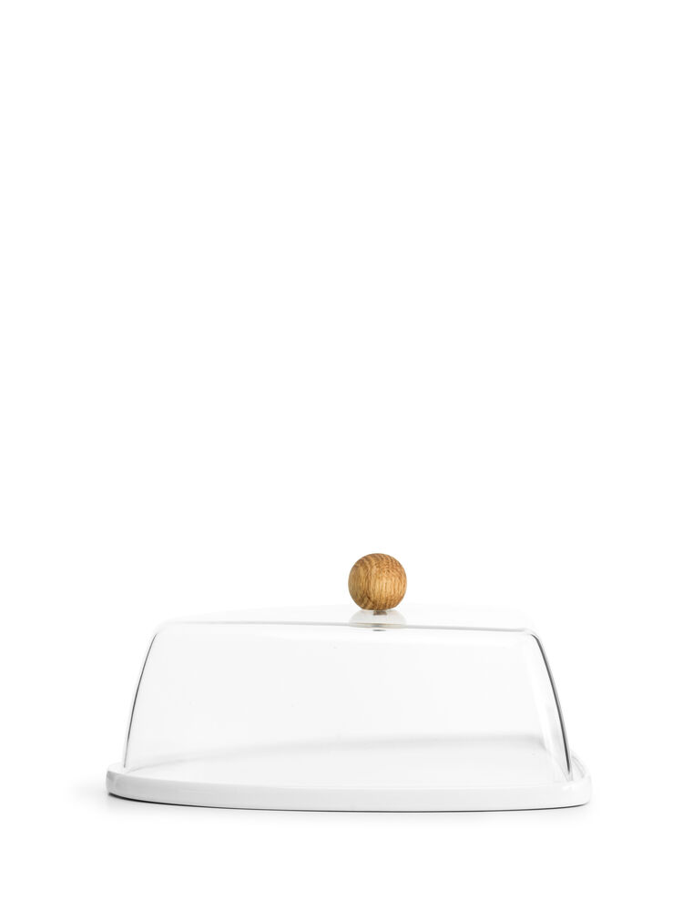 Stilig og praktisk ostklokke. Basen er laget av oppvaskmaskinssikkert stengods og kuppelen er laget av akryl. Utformingen av eikekulen gjør kuppelen enkel å holde og løfte av – en fremtidig klassiker!