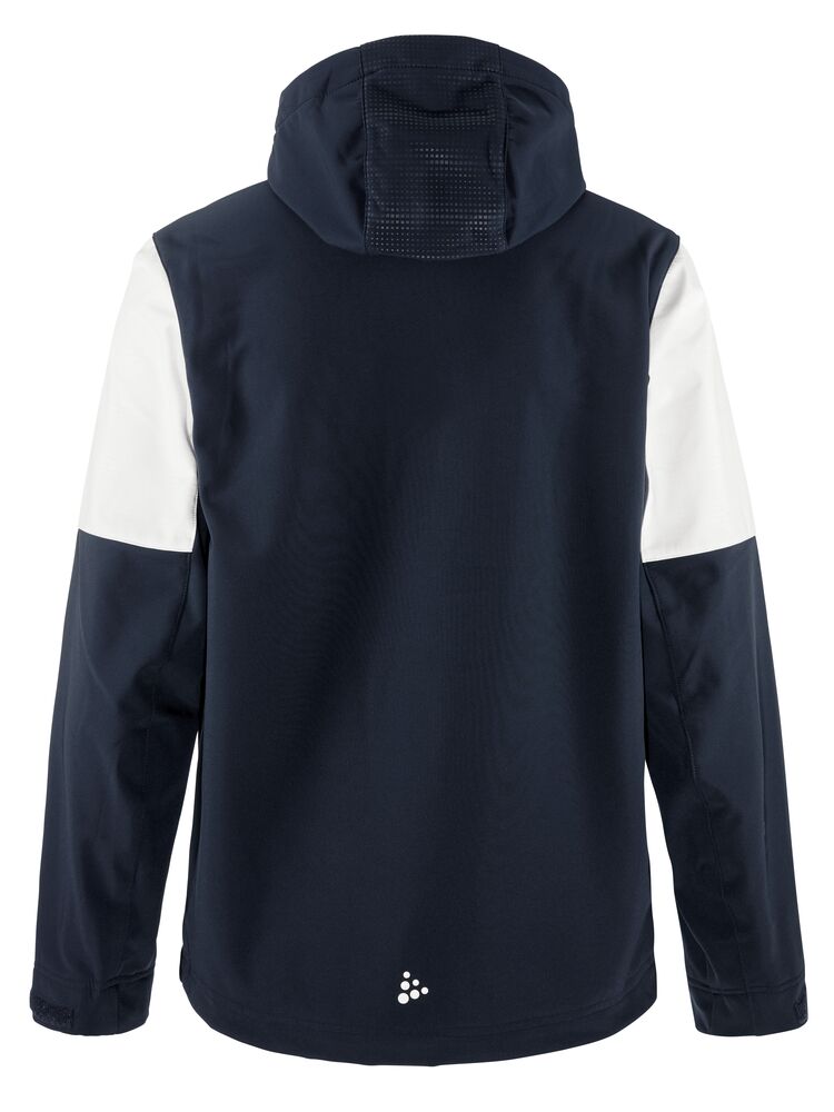 Softshelljakke med børstet innside. 3-lags vind- og vannavstøtende materiale. Jakken har elastisk snøring i hetten og midjen, samt kontrastfargede glidelåser i front og på lommene. To lommer i front. Herrejakken har også brystlomme med glidelås.
