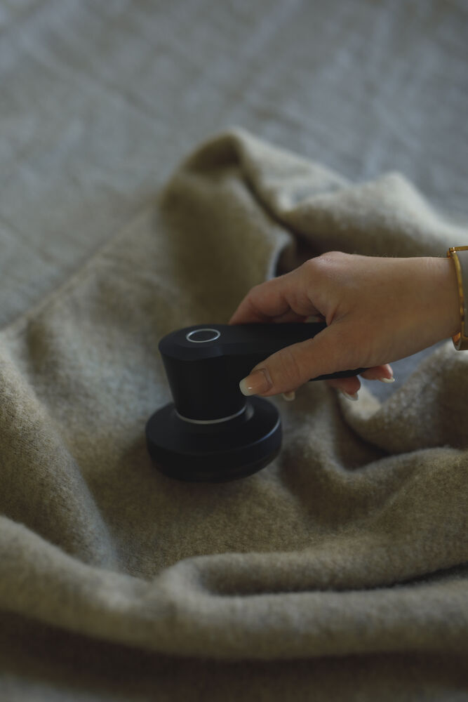 Nuppefjerner i svart plast og metall som hjelper deg med å fjerne lo og nupper fra gensere, luer og tepper. Liten, smidig og enkel å bruke.