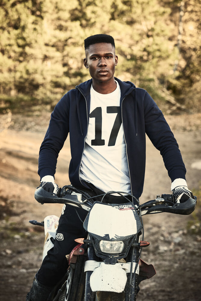 Hettejakke til herre med kontrastfarget glidelås i front. Overhead har stikklommer, hette fôret med singel jersey, samt snor i hetten.