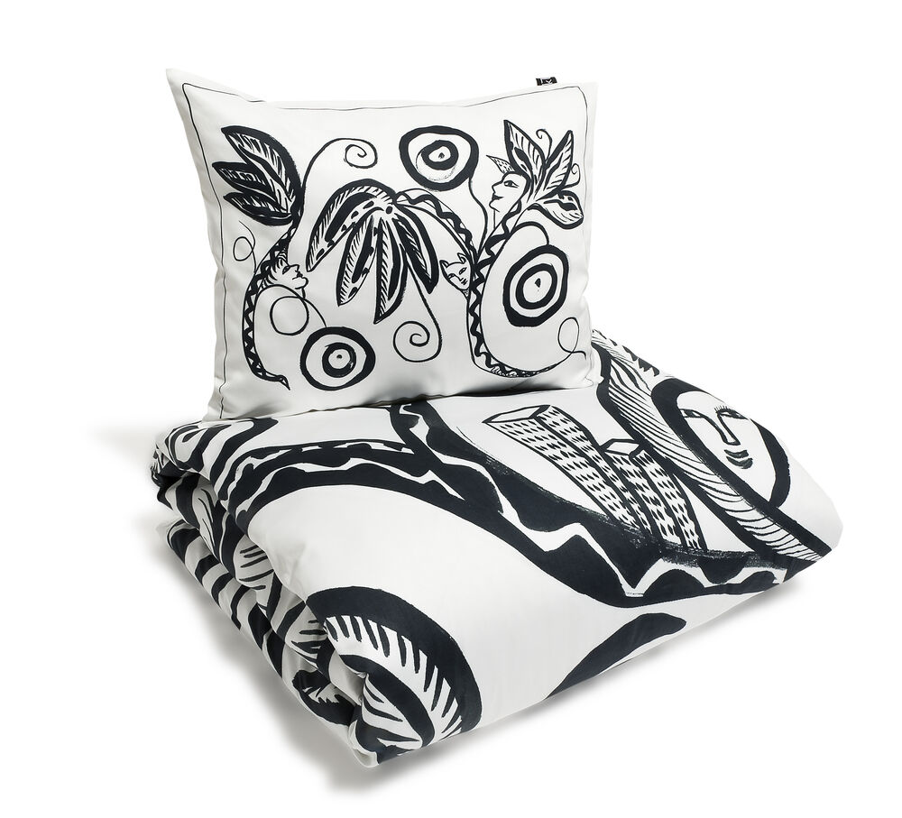 Sengesett av den fineste sateng, med mønster designet av Ulrica Hydman-Vallien.