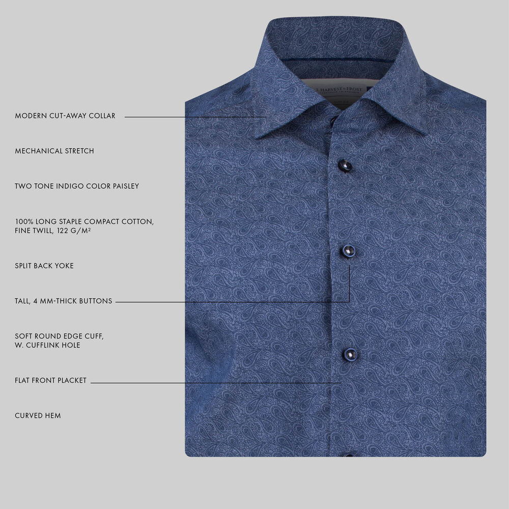 En diskret, men likevel dristig indigofarget paisley-mønstret skjorte. Kle den opp med et slips, eller ned ved å kombinere den med slacks. Uansett holder den deg komfortabel og flott hele dagen ved hjelp av vår beryktede kombinasjon av naturlig strech og strykefrihet. Innovasjon og smart utvikling går hånd i hånd i denne skjorten!