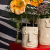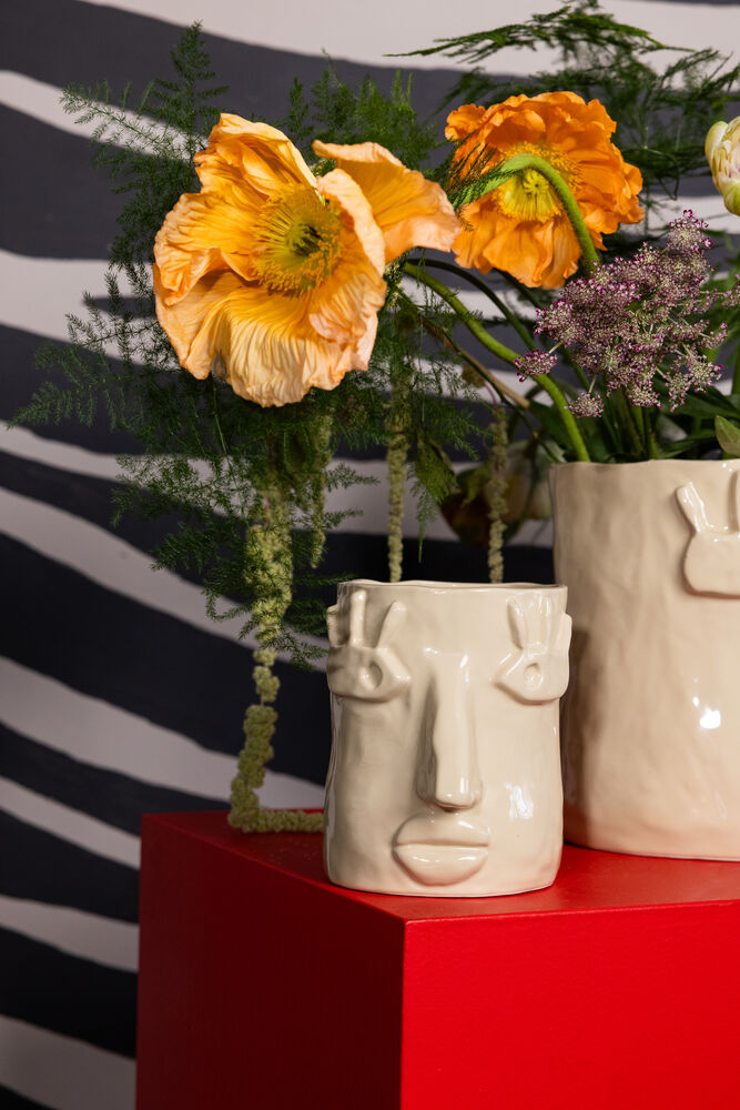 Facy er en selvsikker og uttrykksfull potte, akkurat slik Byon ønsker å være. Inspirert av Emmas malerier oppstår et ansikt som setter et personlig preg på rommet. Den store nesen og den unike formen gjenspeiler tanken om at det ufullkomne er det som gjør kunsten levende, noe Emma alltid formidler i sine skapelser. Facy kan prydes med en frodig plante eller ganske enkelt stå for seg selv som et spennende kunstobjekt. Den beige fargen og steingodsets robuste tekstur gir en varm, taktil følelse som løfter ethvert interiør. Facy finnes i to størrelser. Håndlaget i steingods. Farge- og strukturforskjeller kan forekomme. Alle potter er unike. Farge beige. Design Byon x Emma Widell. Leveres i Byon-eske.