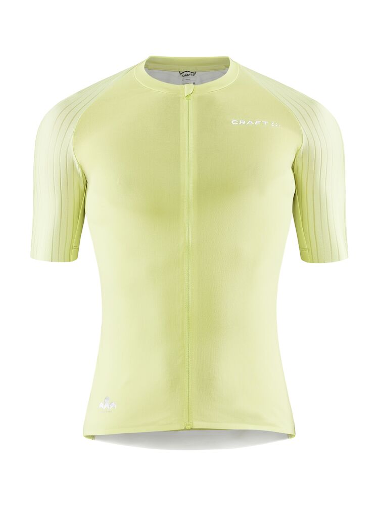 Sykkeltrøyen er laget av et lett, svært funksjonelt materiale og har sonetilpassede paneler med ulike strukturer for å gi minimal luftmotstand og maksimal hastighet. Trøyen har også et perforert panel i ryggen som gir ekstra ventilasjon, samt ekstra lange ermer med råkuttede ermavslutninger.