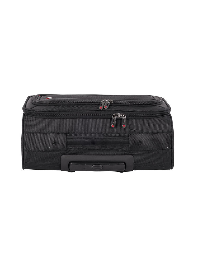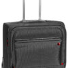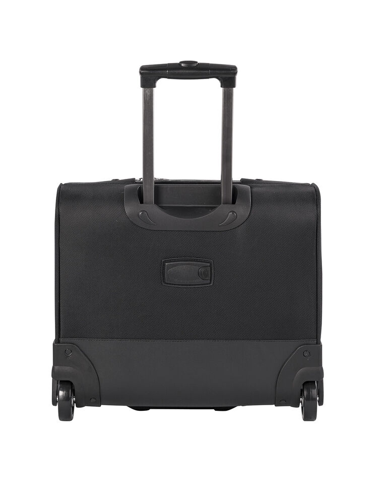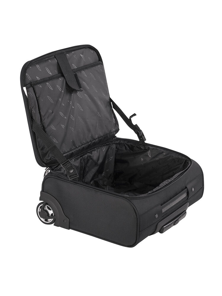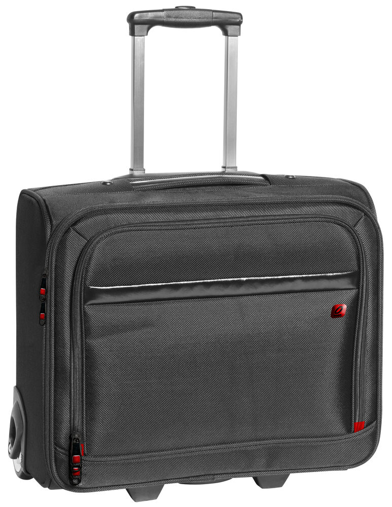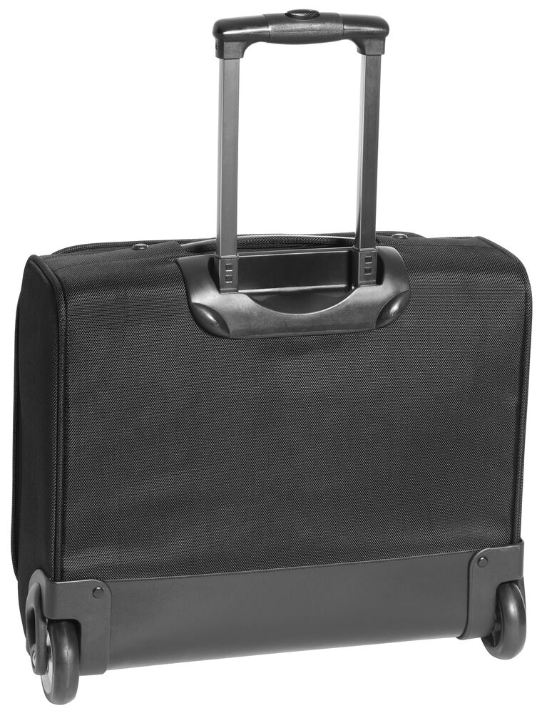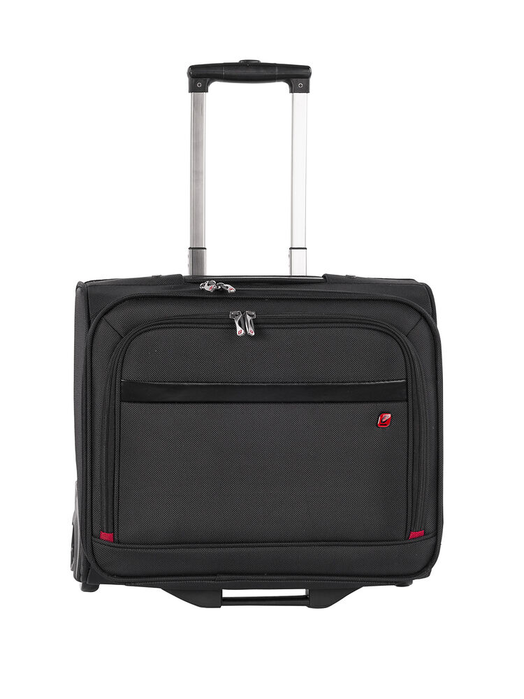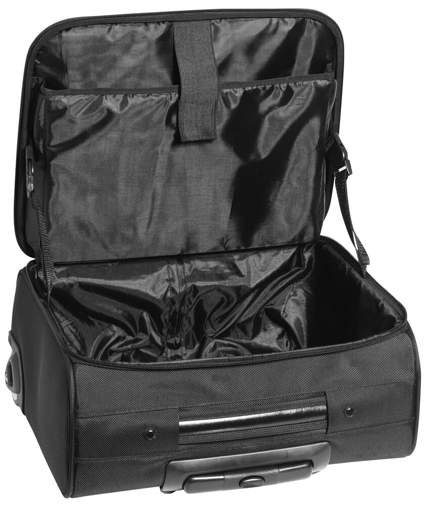 Bag med teleskophåndtak i aluminium og U-formet åpning med glidelås. Justerbar skulderreim, og skolomme i den ene enden. Fôr i et subtilt mønster. Godkjent som håndbagasje i følge IATA.