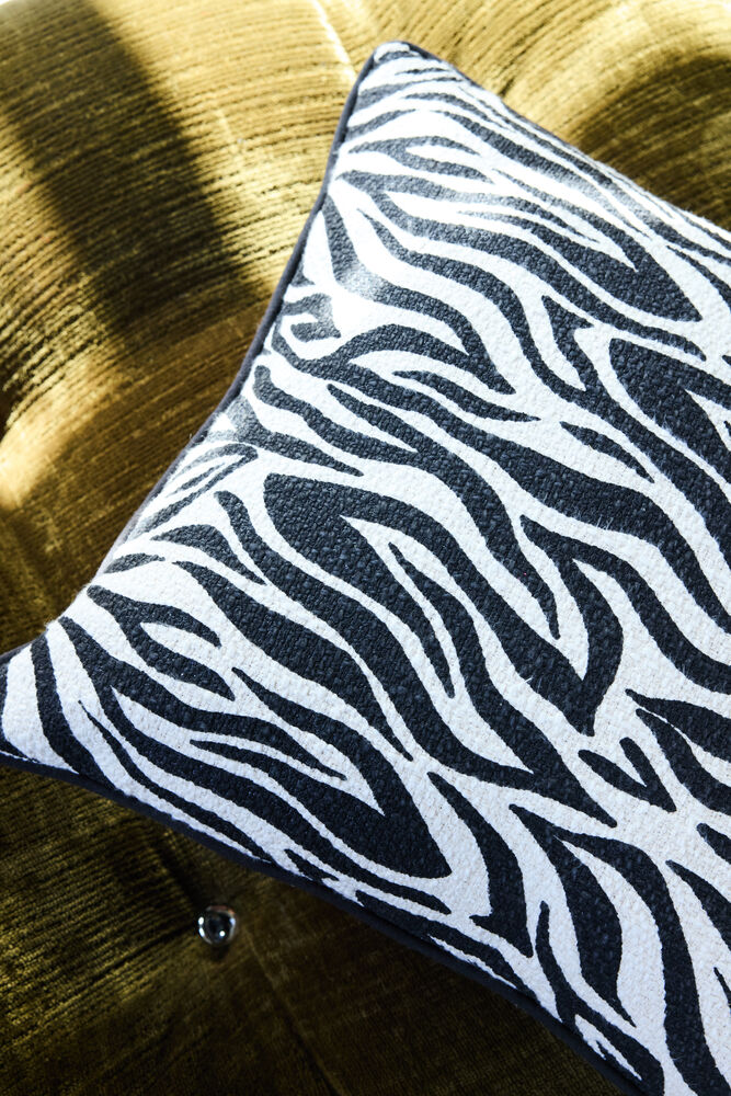 Luksuriøs pute med sebramønster i den fine bouclé-kvaliteten, i en kombinasjon av svart og hvitt. Den strukturerte overflaten løfter følelsen i sofaen, og med sertifisert bomull gjør den inntrykk uansett hvor den plasseres. Størrelse 50 x 50 cm. Innerpute inkludert. Finnes i flere størrelser og farger for å passe alle behov. Kun håndvask. Designet av Byon Studio.