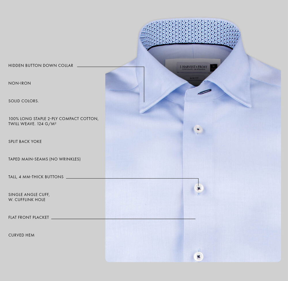 - 100% Langfibret bomull. Non Iron. Tapede hovedsømmer.