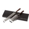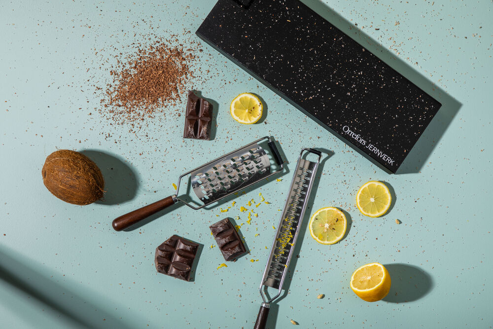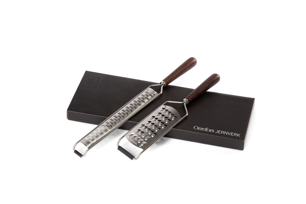 2-pk. rivjern fra Orrefors Jernverk pakket i svart gaveeske. Det lange rivjernet passer godt til å rive f.eks. oster og sitrusfrukter i fine flak. Det brede gourmetrivjernet egner seg godt i matlaging for å rive større flak. Begge rivjern har håndtak i brunt wengetre. Toppen har en gummilist som kan lenes mot underlaget slik at rivingen blir tryggere.