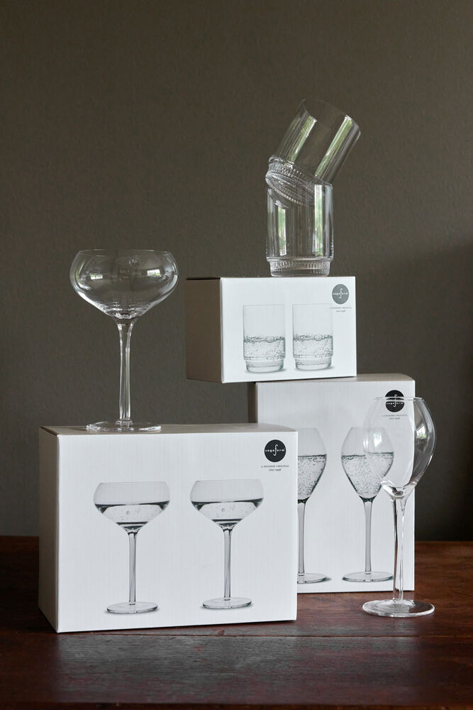 Saga champagneglass tilhører en ny klassisk glasserie fra Sagaform som består av vinglass, champagneglass, champagne coupe, drikkeglass og karaffel. Med sin karakteristiske linjerte fot – som følger alle artiklene i serien – skiller den seg ut, men smelter også inn. Saga er perfekt til juice og melk ved frokostbordet, men har også kraft og styrke til å løfte et festbord til noe helt ekstra. Saga kan med fordel blandes med glassene du allerede har, og er derfor en perfekt gave og en ønskelig serie å samle på. Rett og slett en svensk original.