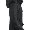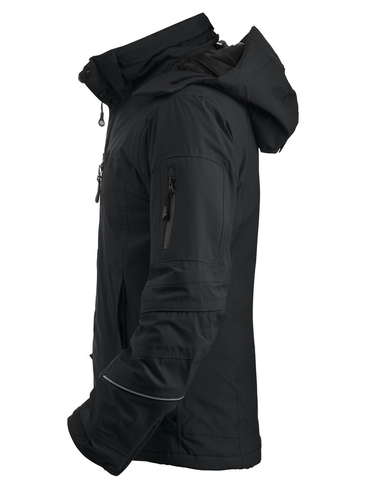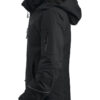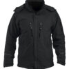Vattert softshelljakke med avtagbar hette og snølås. Formsydde ermer, skjulte mansjetter. Innvendig lomme med snor og reflekterende piping på ermene. W/P 5000 MVP 5000.