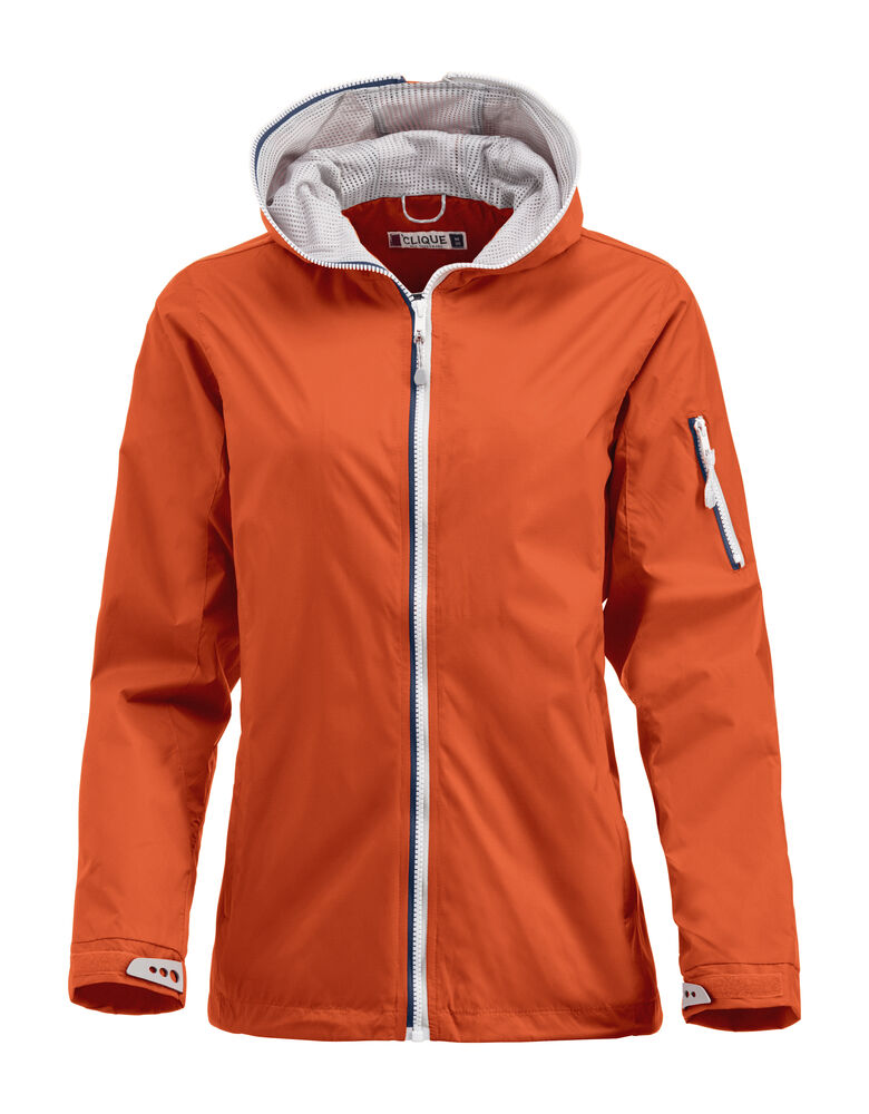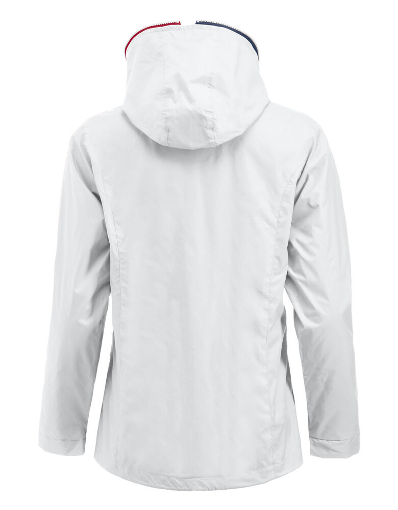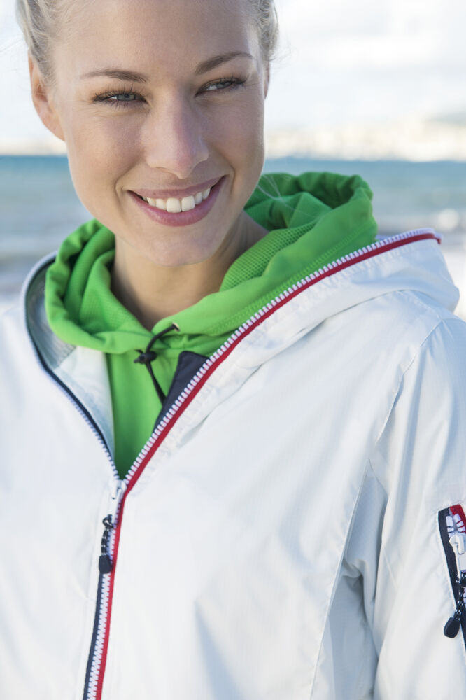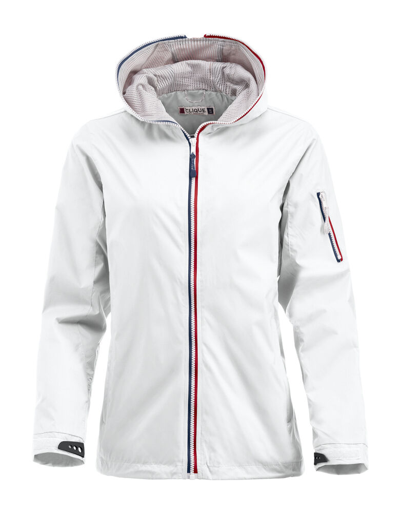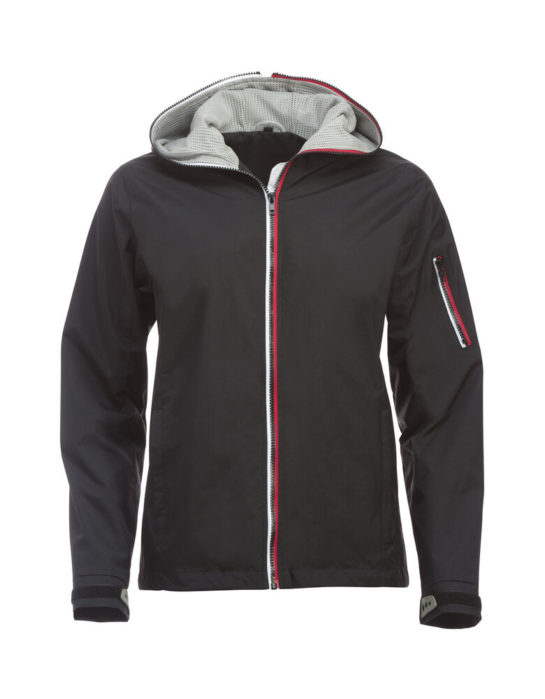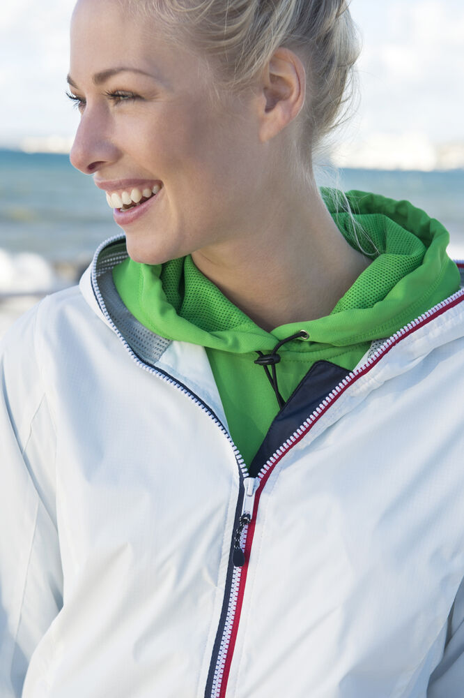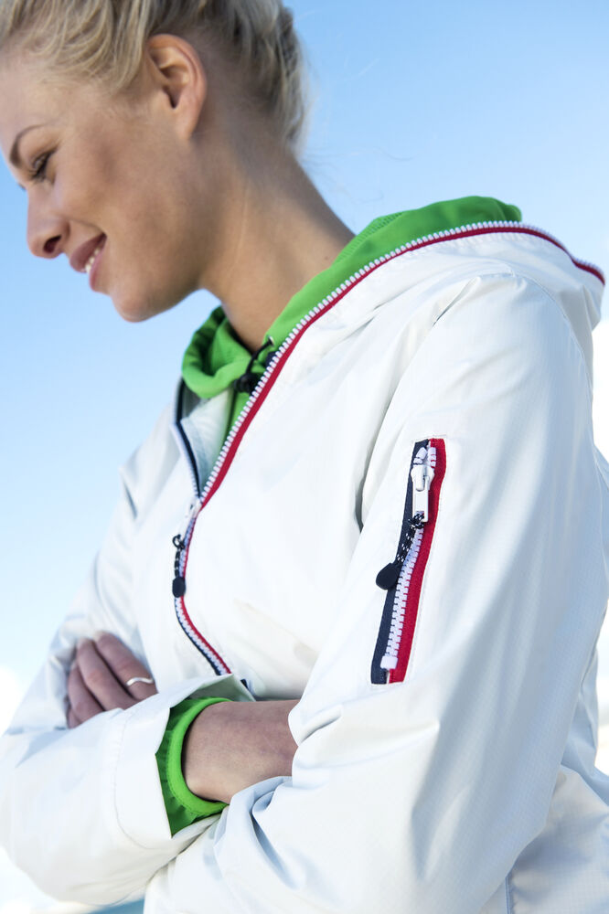 Trendy ripstopjakke med meshfôr og trefarget glidelås i front og på ermlommen. Fast hette, to sidelommer og en brystlomme.