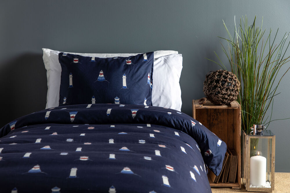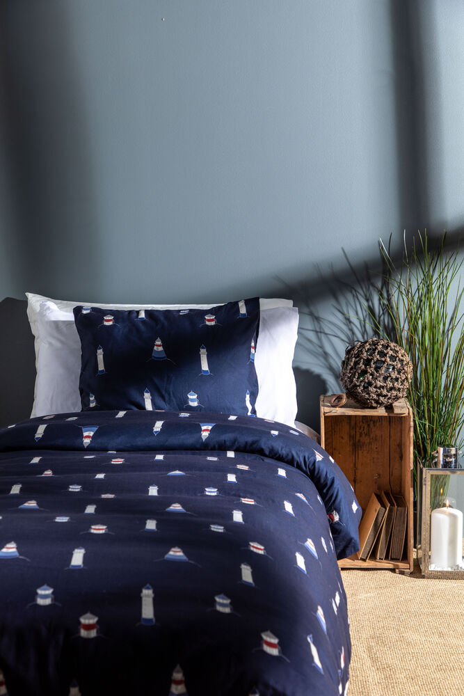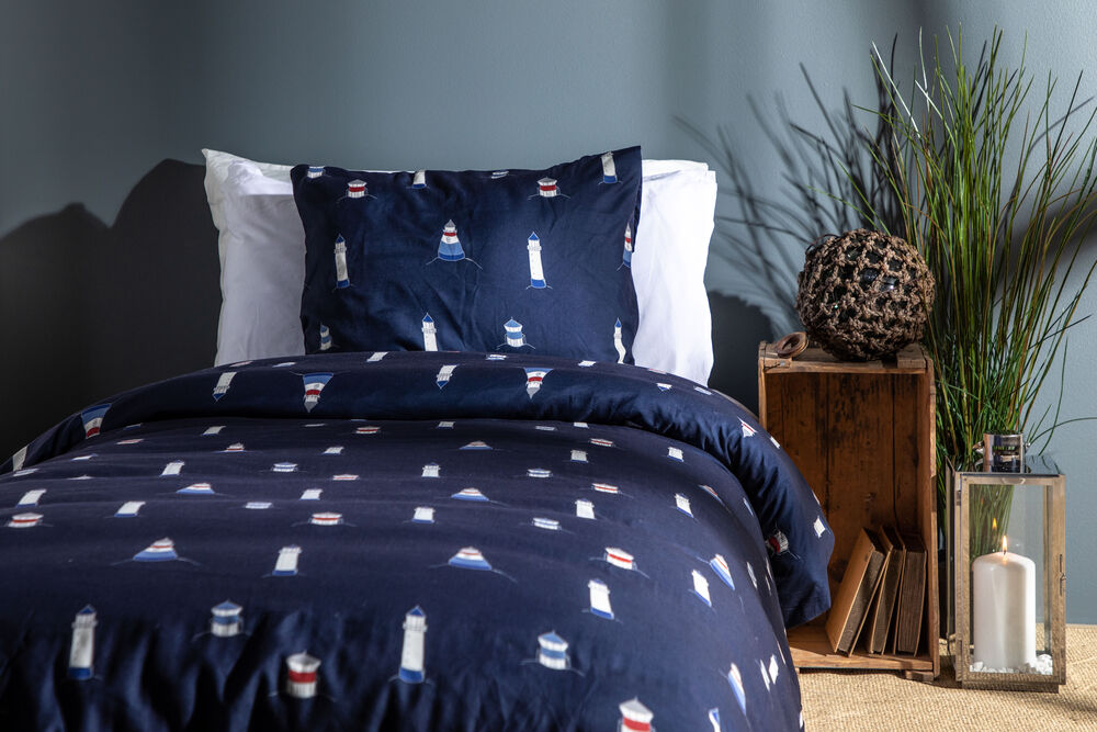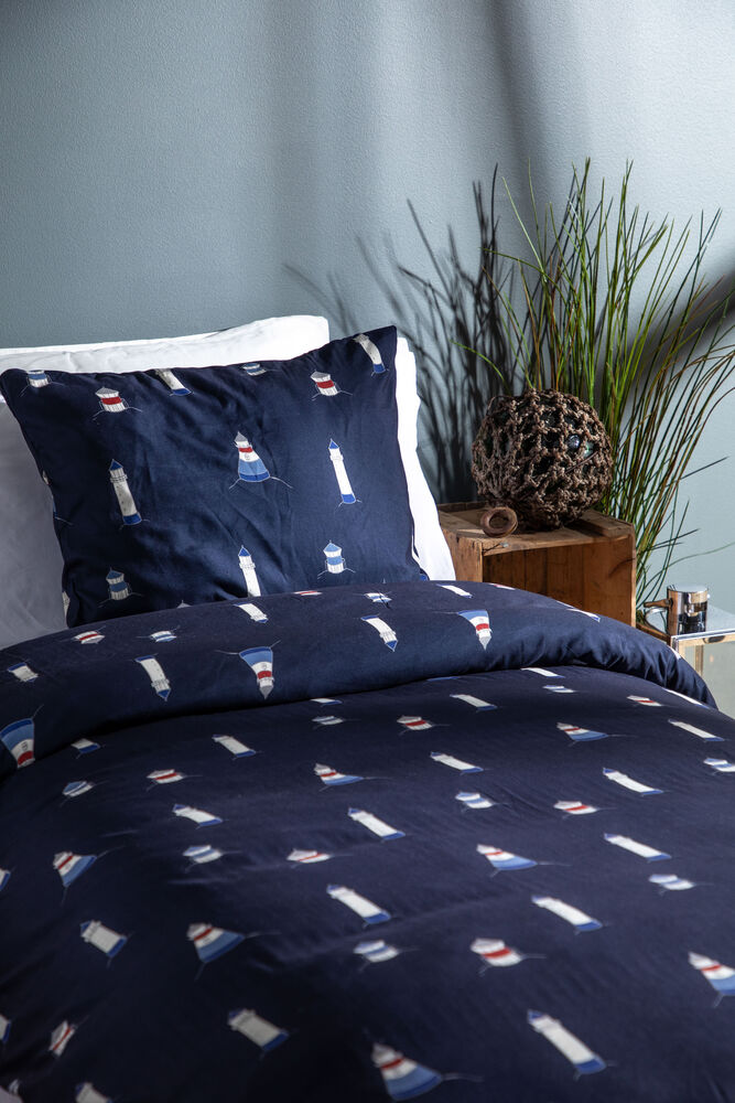 Karlsvik sengesett i mikrofiber fra Lord Nelson Victory. Med mønster av fyrtårn i forskjellige størrelser på en marineblå bakgrunn, vil du sove godt med drømmer om din neste båttur. Hvilke fyrtårn vil du besøke neste gang? Sengesettet er laget av polyester/mikrofiber med den positive egenskapen at det tørker raskt og veier lite. Mikrofibersengetøy har blitt populært for bruk i både båter og campingvogner fordi de er enkle å pakke med seg og fungerer godt i fuktige omgivelser.