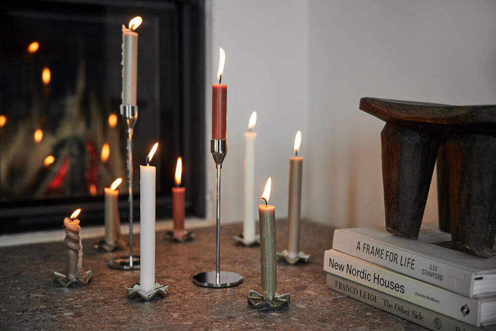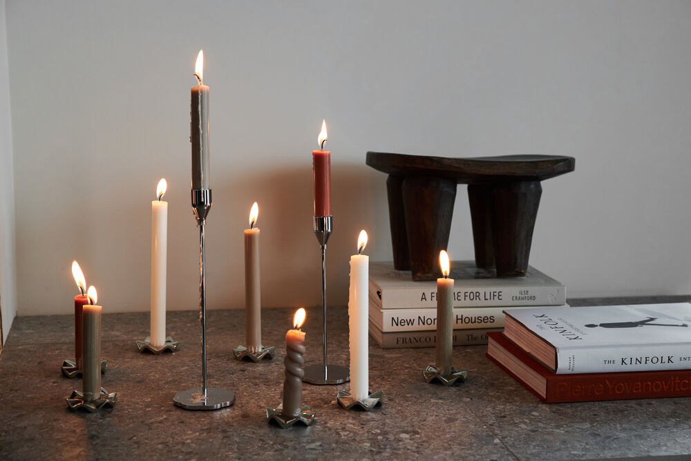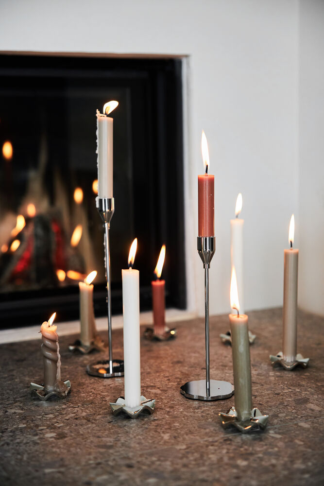 Siri lysestake har et klassisk design som passer til det meste, og enkelt finner sin plass i de fleste hjem. Sokkelen på lysestaken har samme organiske blomsterform som Signe og bringer tankene til naturen. Siri finnes i to høyder som sammen skaper liv. Materialet er rustfritt stål med finpusset overflate. Passer både alene og i gruppe. Fin på spisebordet og perfekt som gave.
