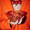 Skålen Cara er en fargeklatt, en brennende karamell med et konfetti-regn av rødt og oransje. Bowl Cara er håndlaget og håndblåst, noe som gjør hvert produkt unikt. Perfekt til snacks, oliven eller med et telys.