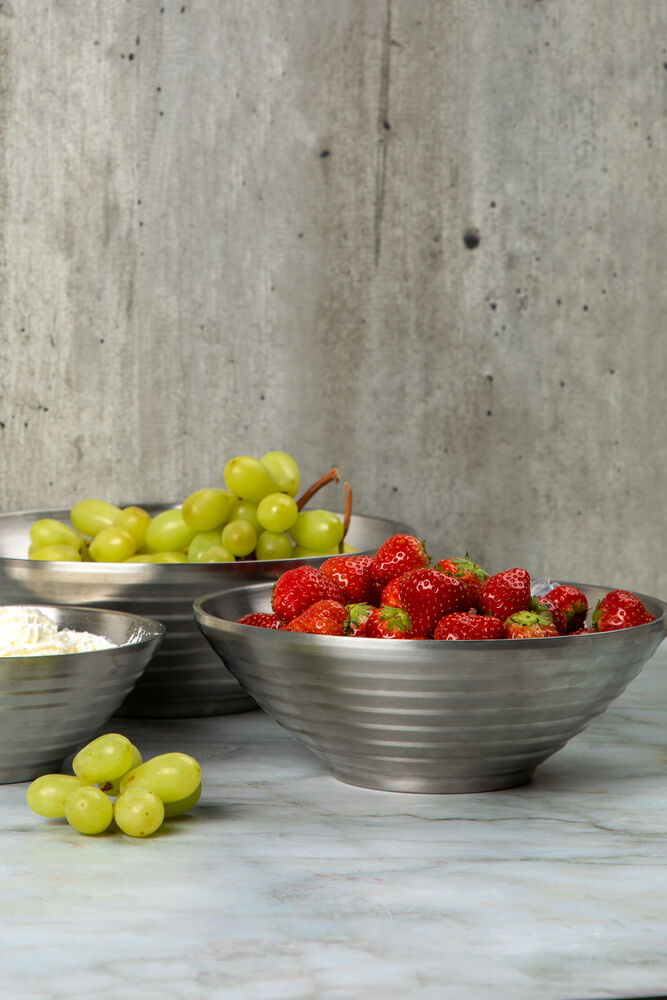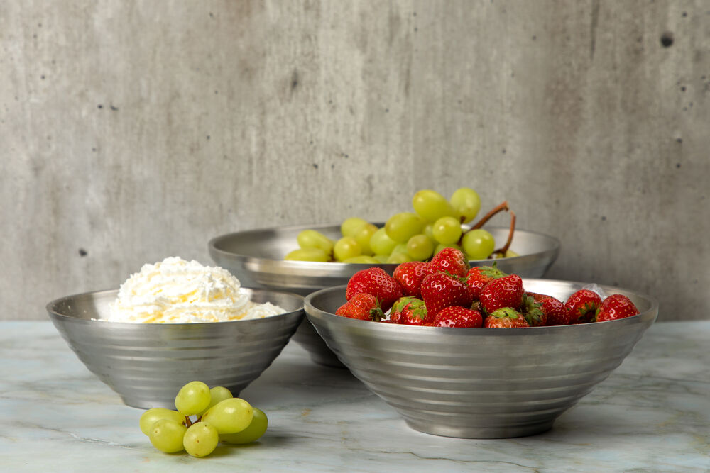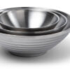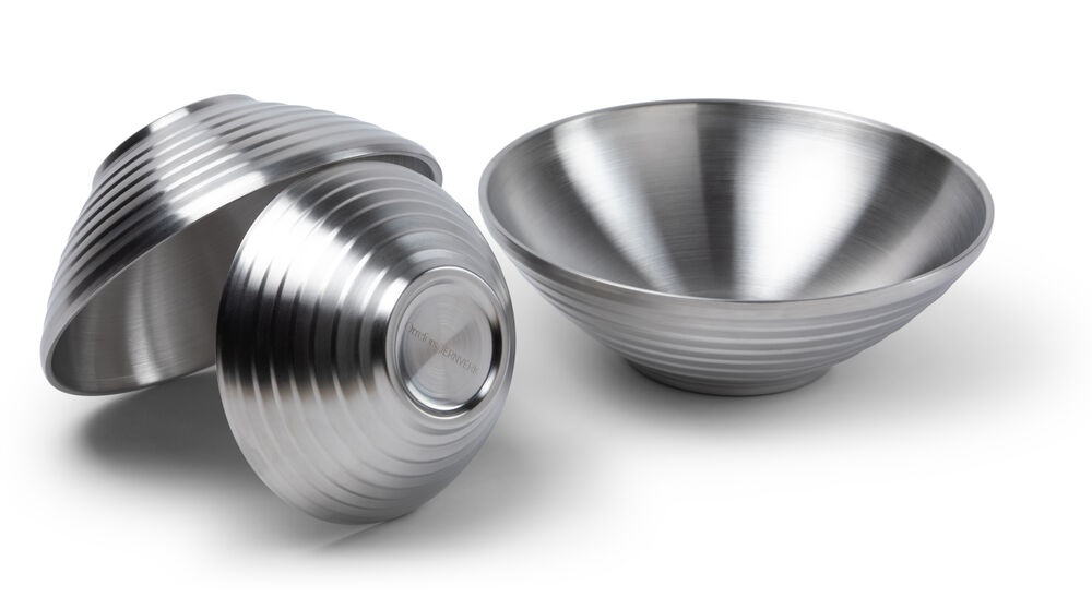 Alle gode ting er tre – Orrefos Jernverks stålskåler er stilige og eksklusive å bruke til baking, marinering og til salater. Her har vi flere bruksområder i ett. Boller med doble vegger som isolerer både varme og kulde. Perfekt til servering av saus og supper, samt sjømat eller iskrem.