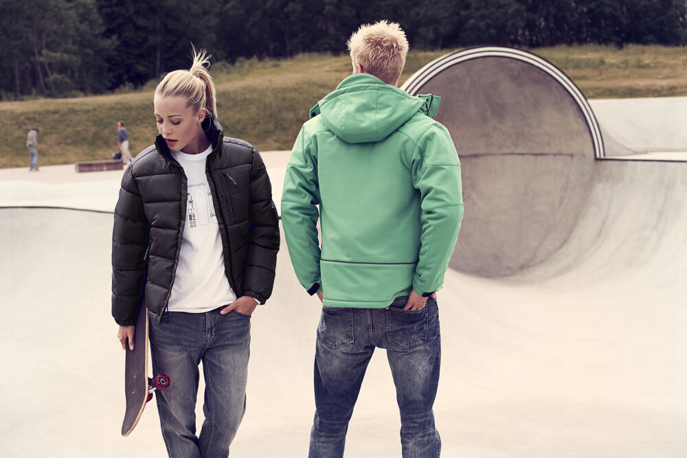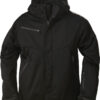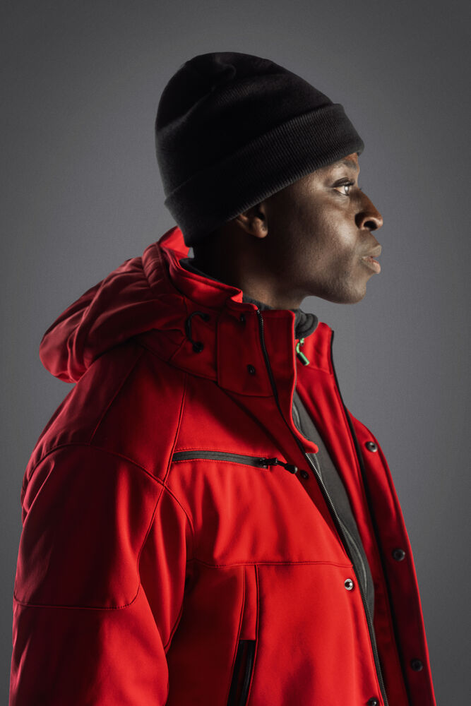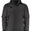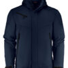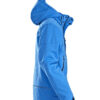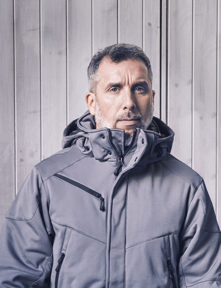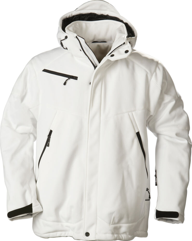 Vattert softshell med avtagbar hette og formsydde ermer. Snorstramming i linning. Ermene kan justeres med borrelås. Lommer med glidelås i front, 2 innerlommer med glidelås, samt en innerlomme av mesh.