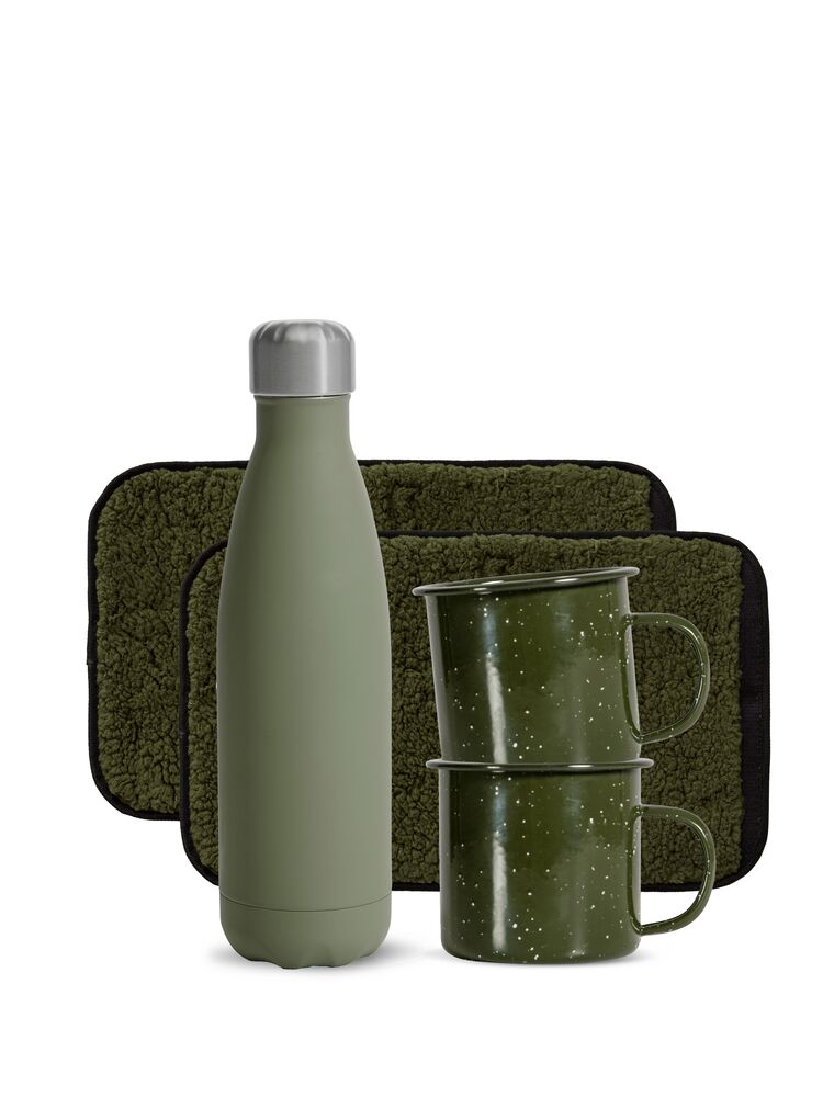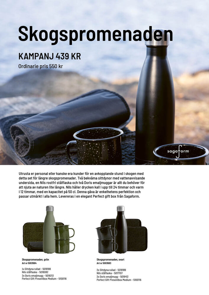 Utrust dine ansatte eller kanskje dine kunder for en avslappende stund i skogen med dette settet for lengre skogsturer. To komfortable sitteunderlag med vannavvisende underside, en Nils rustfri stålflaske og to Doris emaljekopper er alt du trenger for å nyte naturen litt lenger. Nils holder drikken kald i opptil 24 timer og varm i 12 timer, med en kapasitet på 50 cl. Denne gaven er enkelhetens perfeksjon og passer utmerket i alle hjem. Leveres i en elegant Perfect gift box fra Sagaform.