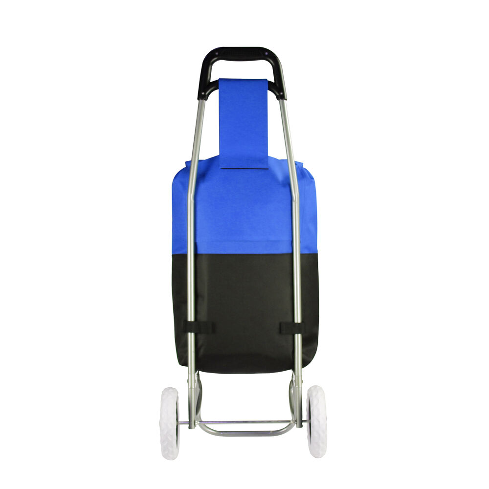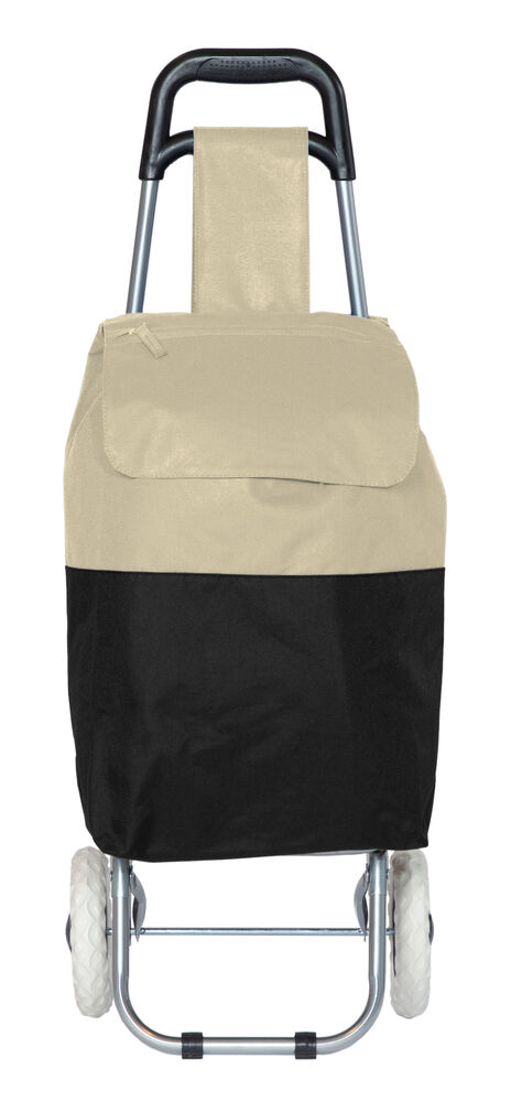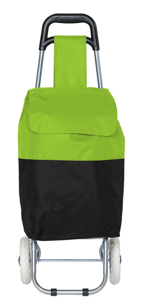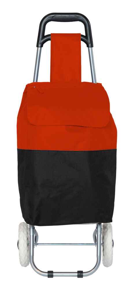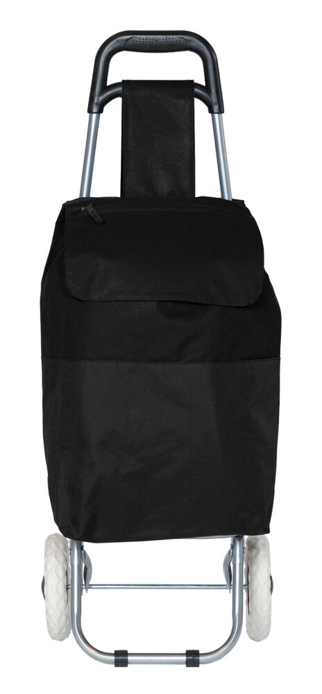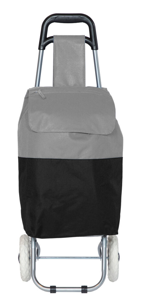 Shoppingtralle med et stort hovedrom, lomme med glidelås og avtagbare hjul.